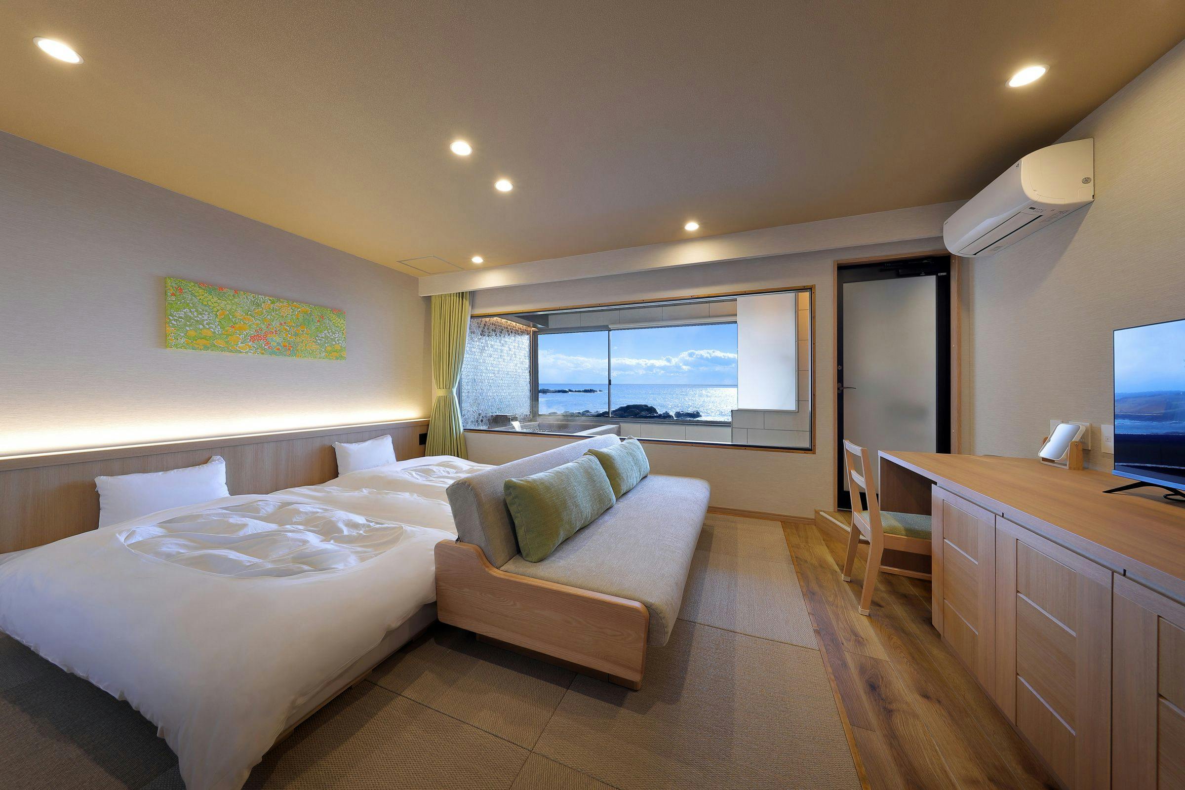 2023年リニューアル!太平洋を一望する展望風呂付き客室です。大きな窓から眼下に広がる太平洋を眺めながら入ることができる展望風呂!贅沢なひとときをお楽しみください。寝室は、セミダブルタイプのベッドが2台、エキストラベッドにもなる、ソファベッドが1台のご用意がございます。お部屋に、電子レンジやポットのご用意がございますので、おこもりワーケーションにも最適です。※館内にはエレベーターがございません。階段の利用となります。