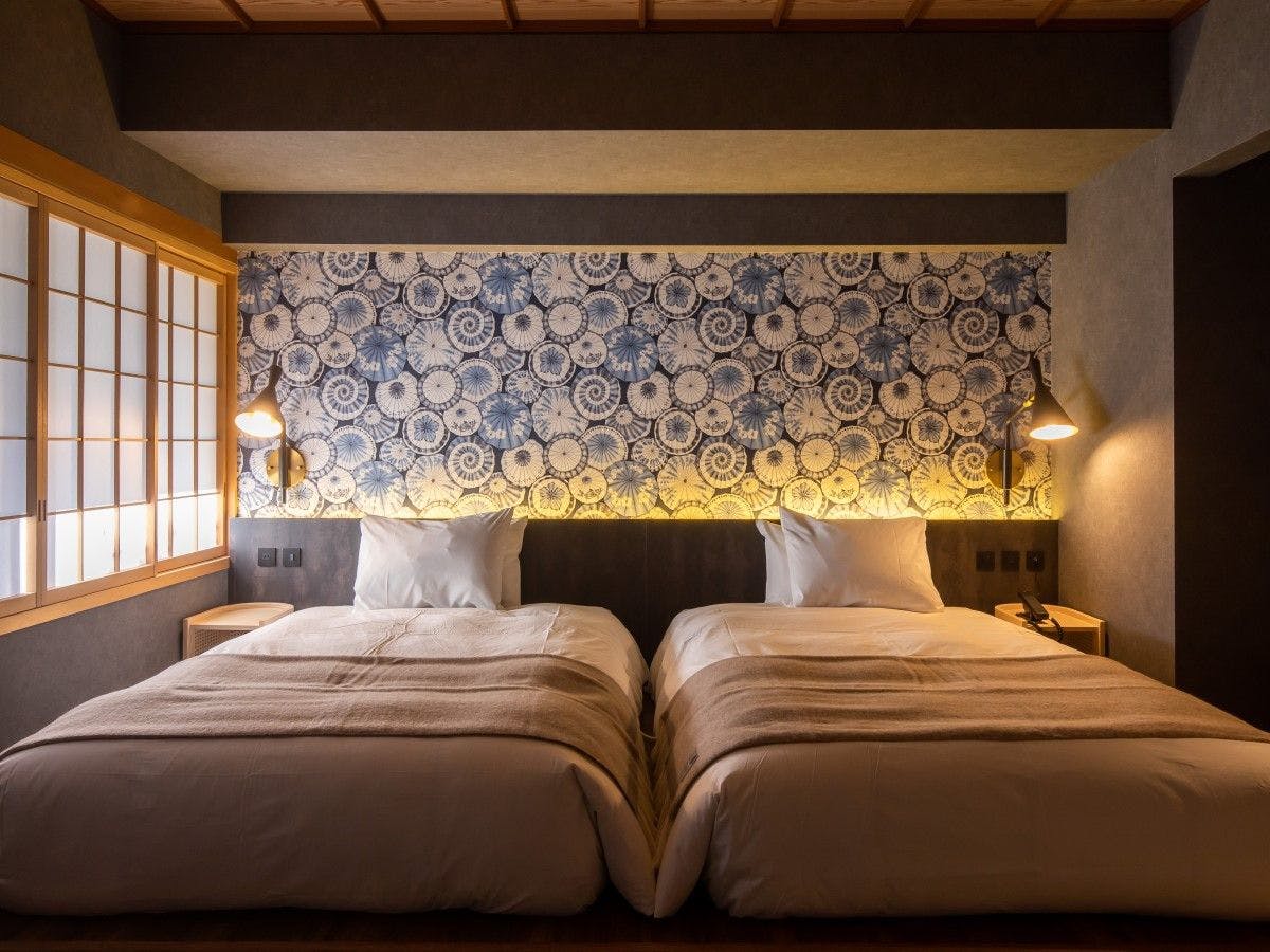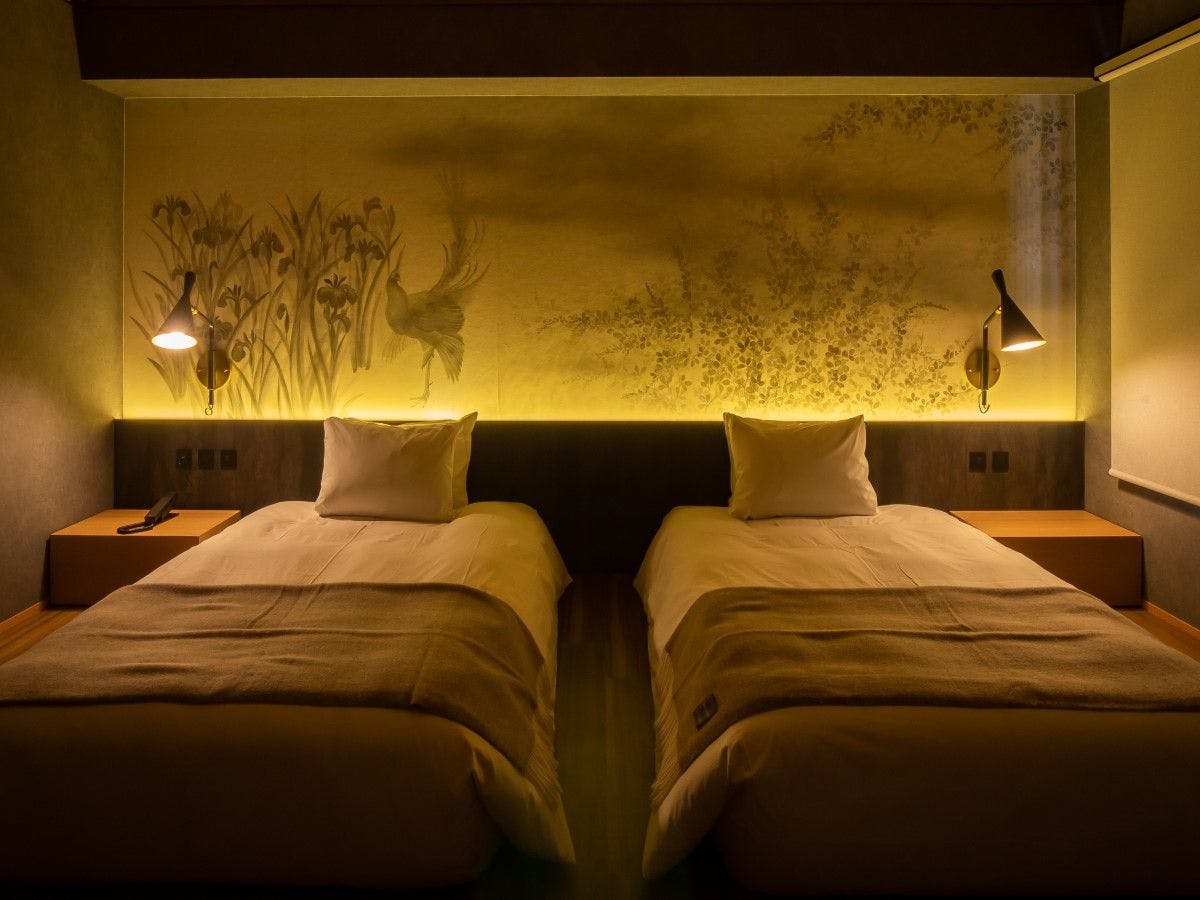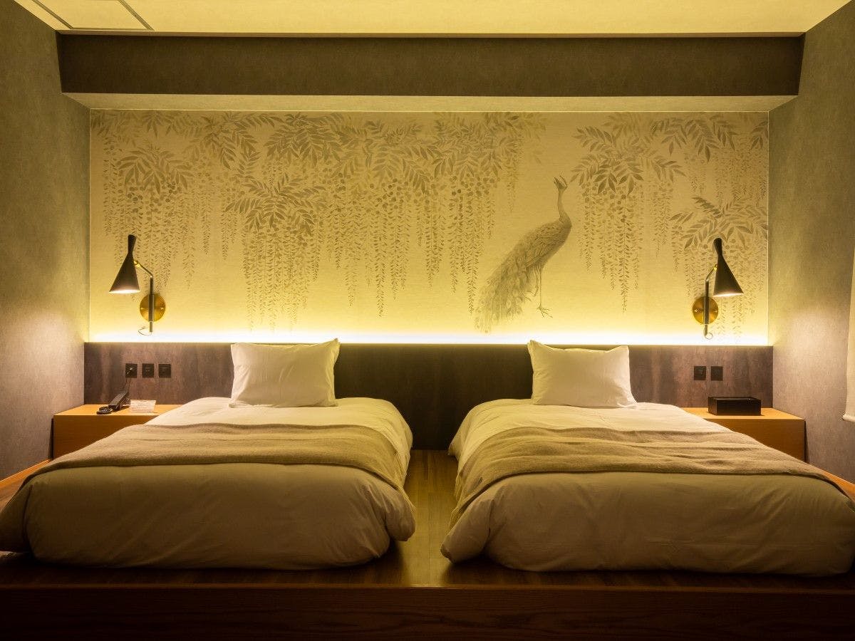 ・110cm幅のシモンズマットレスのシングルベッド2台を備えた和洋室