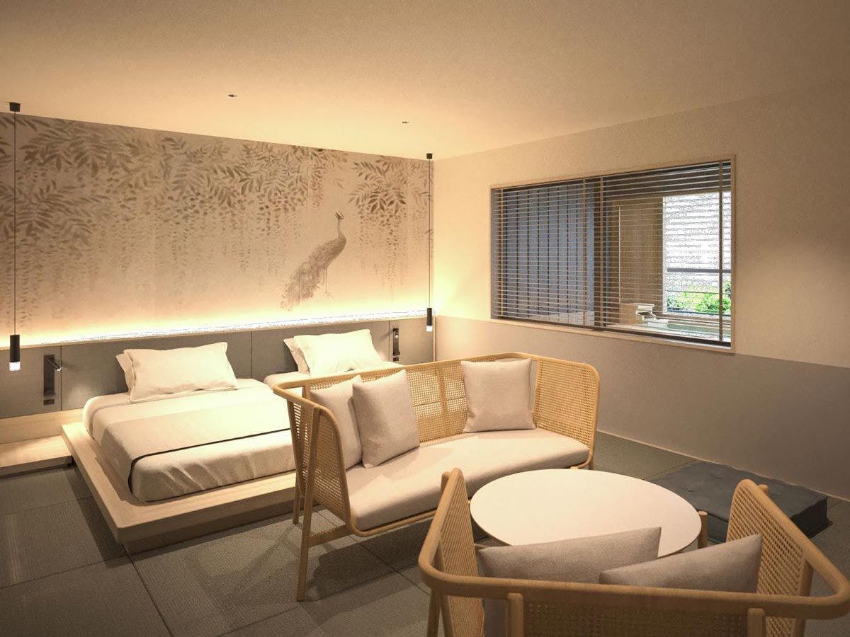・ローベッドとソファセットを備えた琉球畳敷きの和洋室