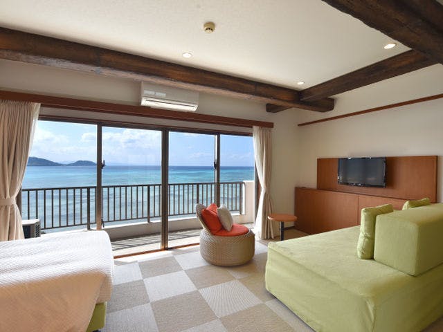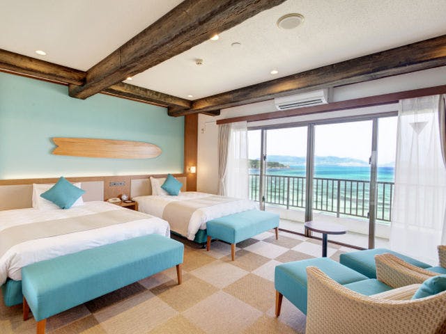 エメラルドグリーンに輝くビーチに面したリゾートホテル。全室オーシャンビューのホテル館と、コテージタイプがあり、それぞれ異なった雰囲気。ホテルオリジナルマリンメニュー等で石垣の魅力を存分に楽しめます。