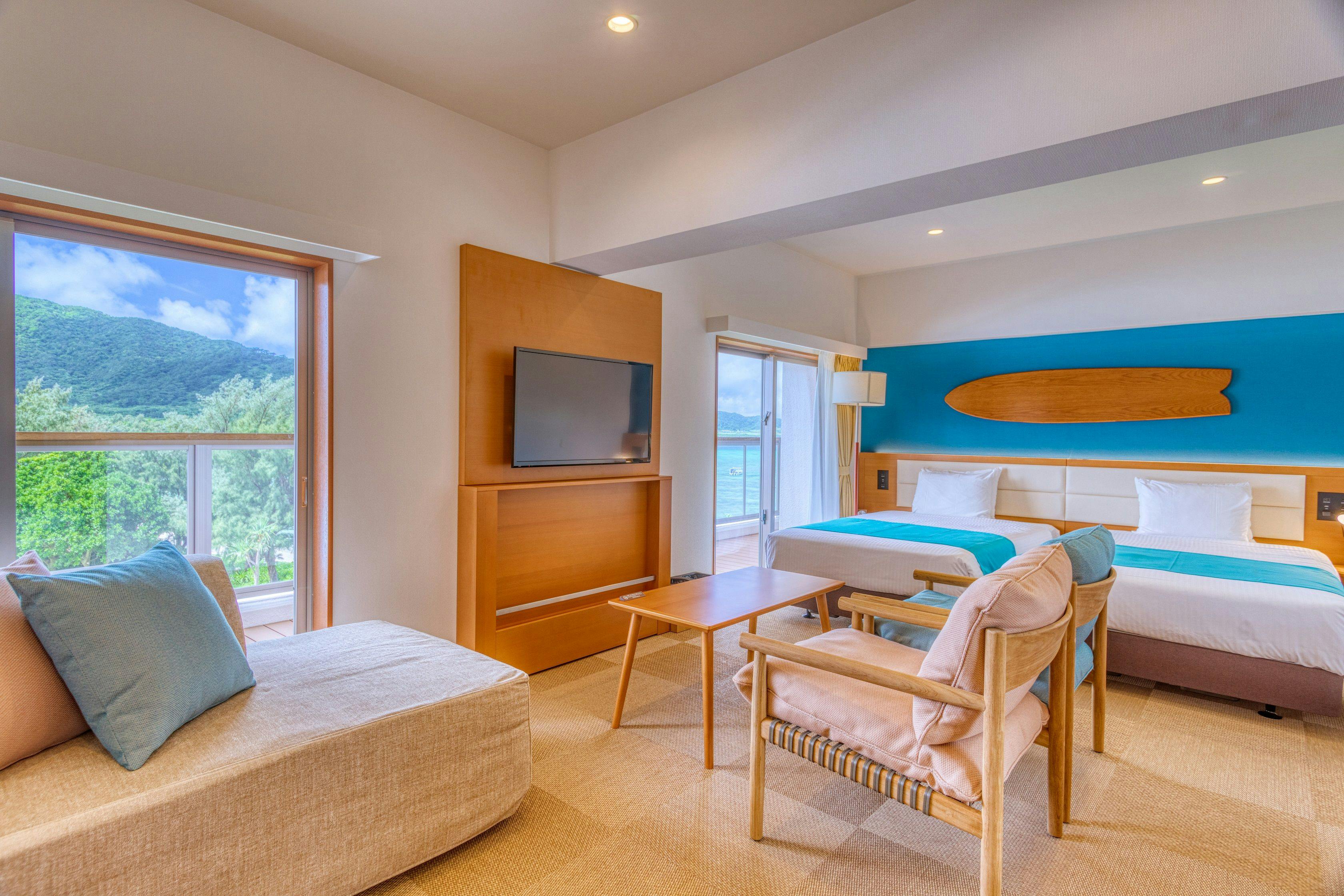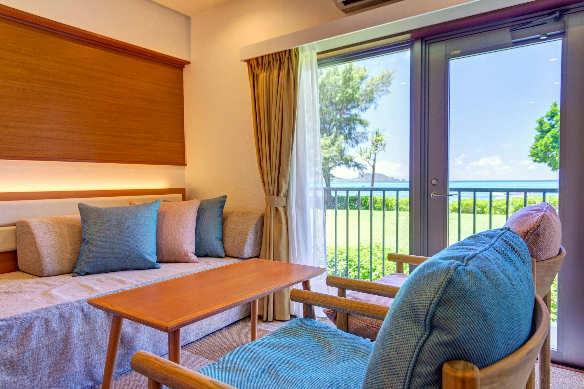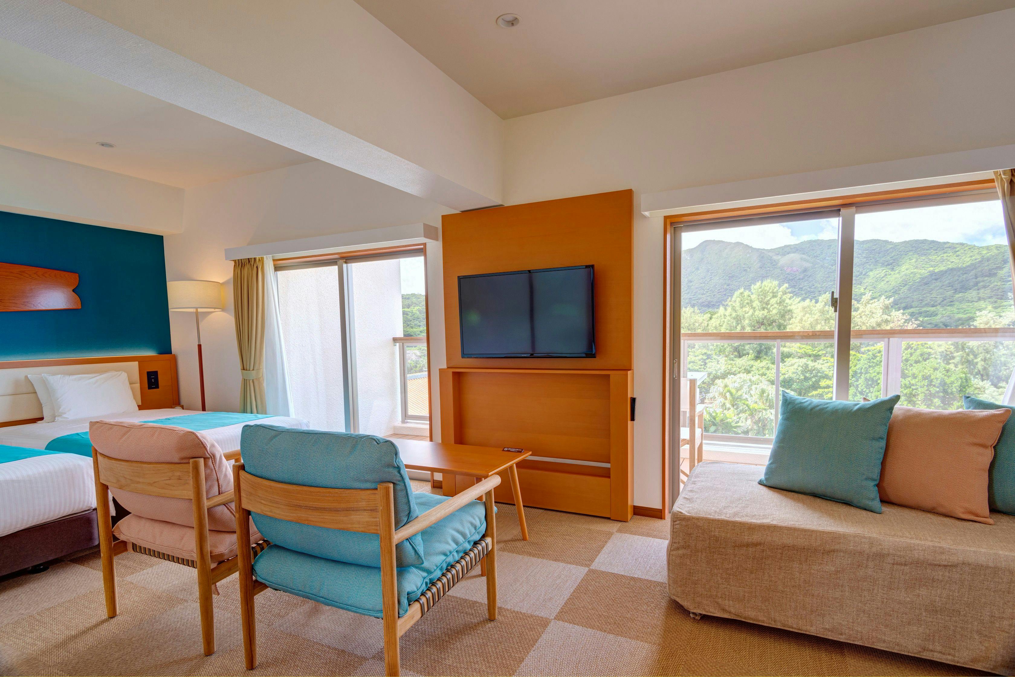 海岸林の緑にポリネシア風かやぶきヴィラがならぶかびらビレッジ。 プライベート感を大切にした一棟一室のコテージタイプのお部屋です。 広々した室内は落ち着いた木の風合い。 ジェットバスを備えた森のテラスで優雅な時間をお過ごしください。