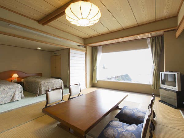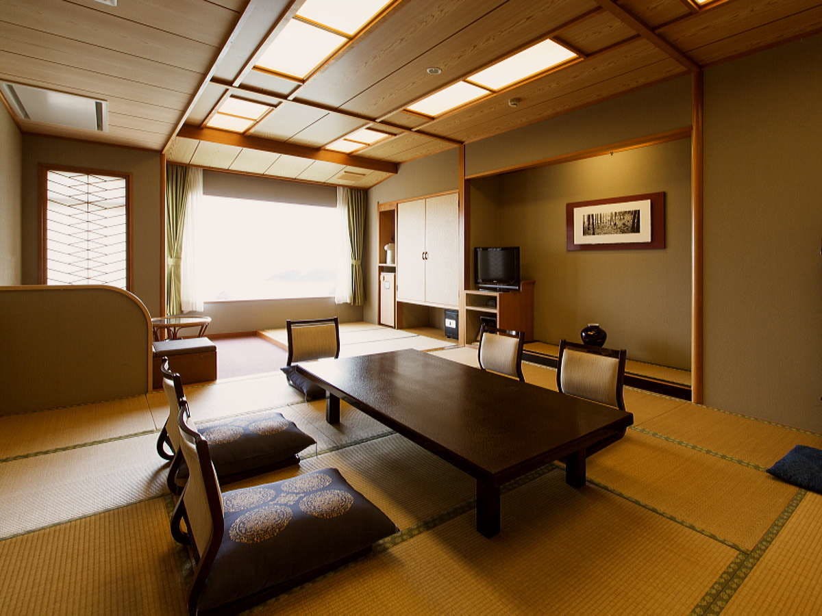 眺望の良さを最大限に生かす大きな窓を配した、純和風の造り。定員5名様。シャワートイレ・ドライヤー付。2018年7月1日の予約から全室禁煙となります。Wi-Fi接続(無料)
