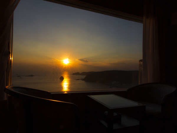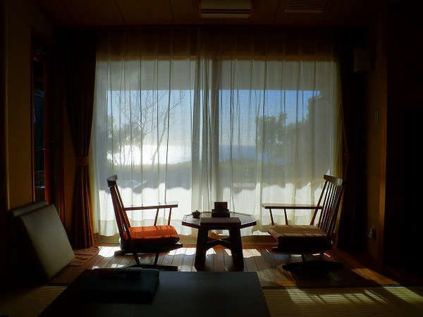 和室12畳と6畳の2間続き、襖で仕切れます。パーシャルオーシャンビュー。このお部屋は正面に海が見えません(ご来光も見えません)斜めに海を望むタイプです。2018年7月1日の予約から全室禁煙となります。Wi-Fi接続(無料)