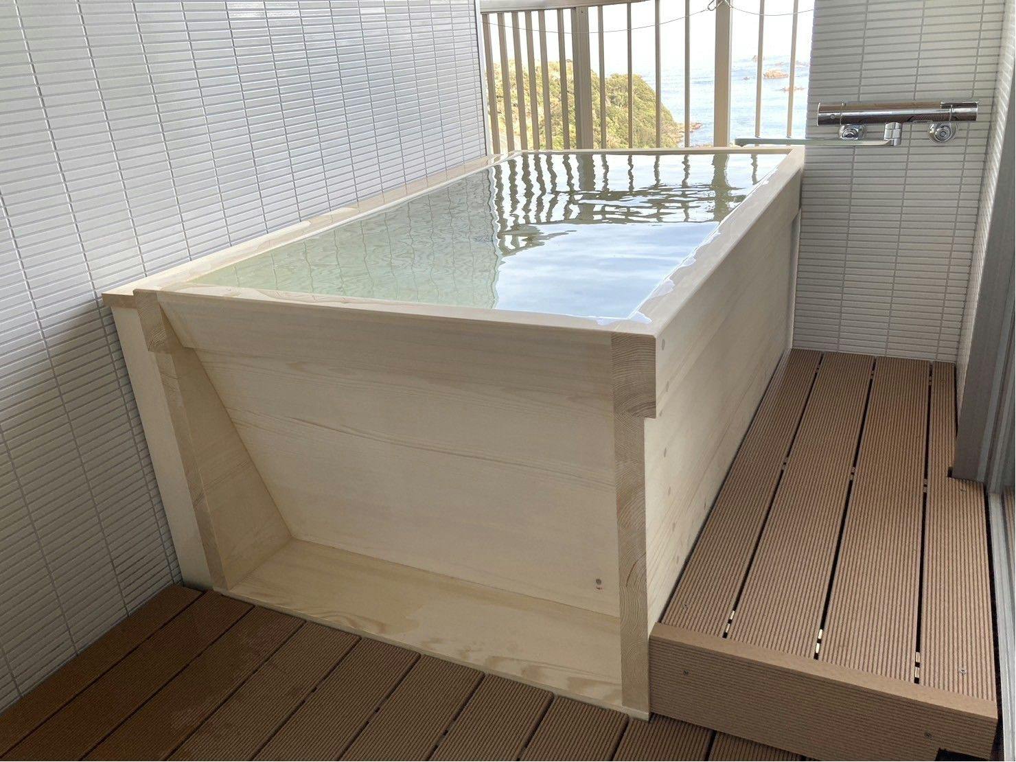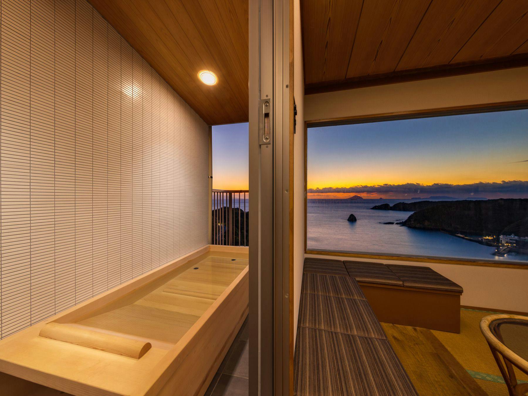 和風庭園の先にコバルトブルーの海を臨む専用露天風呂付客室。露天風呂は【檜】。専用露天風呂は源泉掛け流し、滞在中いつでも入浴可能です。2018年7月1日の予約から全室禁煙となります。Wi-Fi接続(無料)