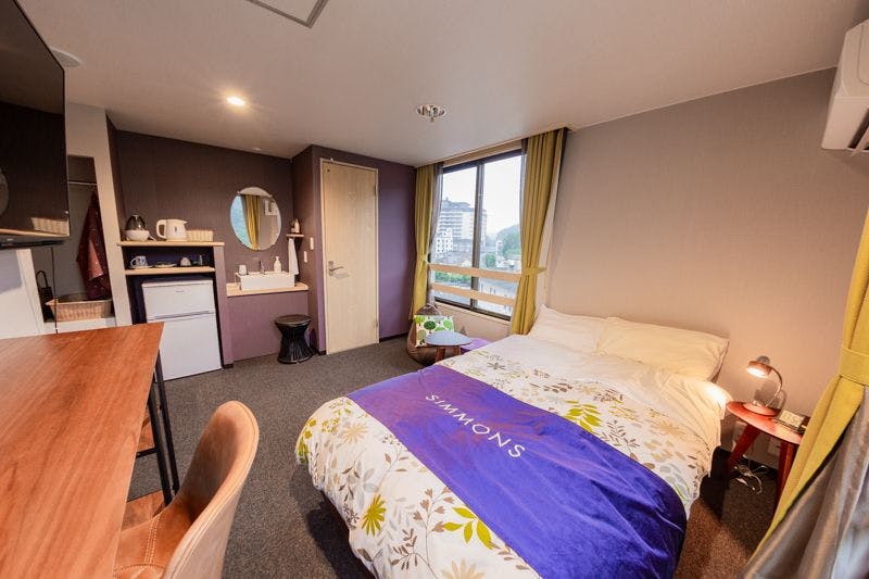 モダンながら落ち着いた装いの客室は、シモンズ社のダブルサイズのツインベットを設置、滞在中はかけ流しの温泉と心地よい眠りで癒しのひと時をお過ごしください。