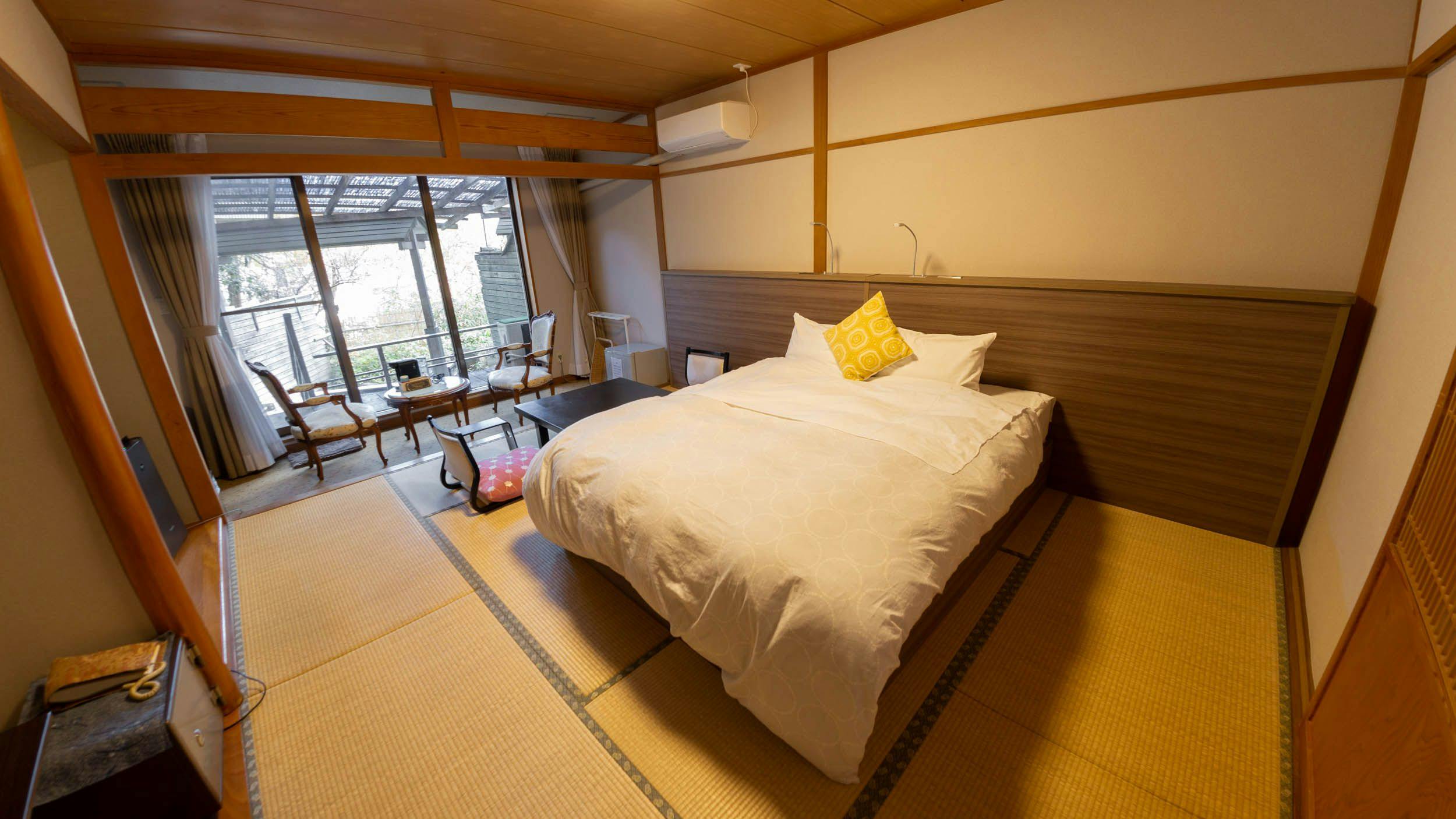 ベットルーム+広縁+ユニットバス+露天風呂 3名で利用の場合、1名は布団になります。