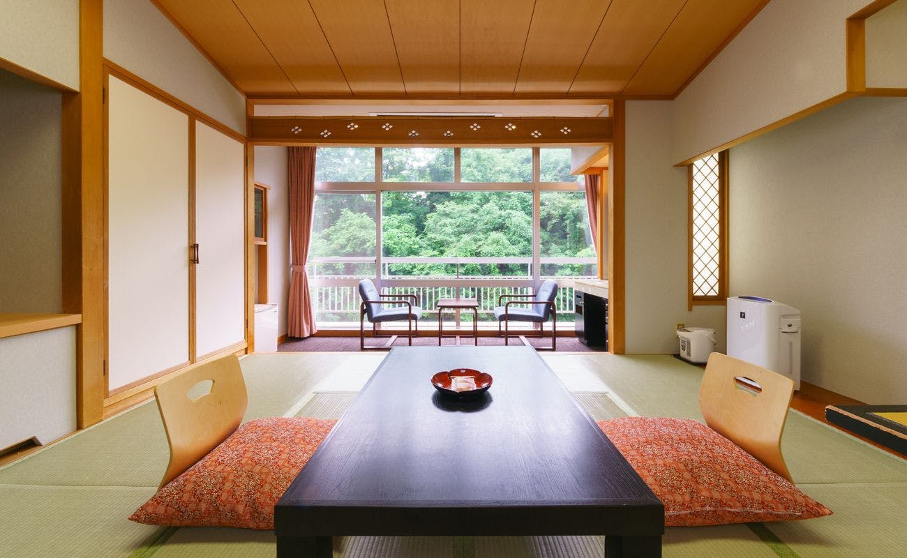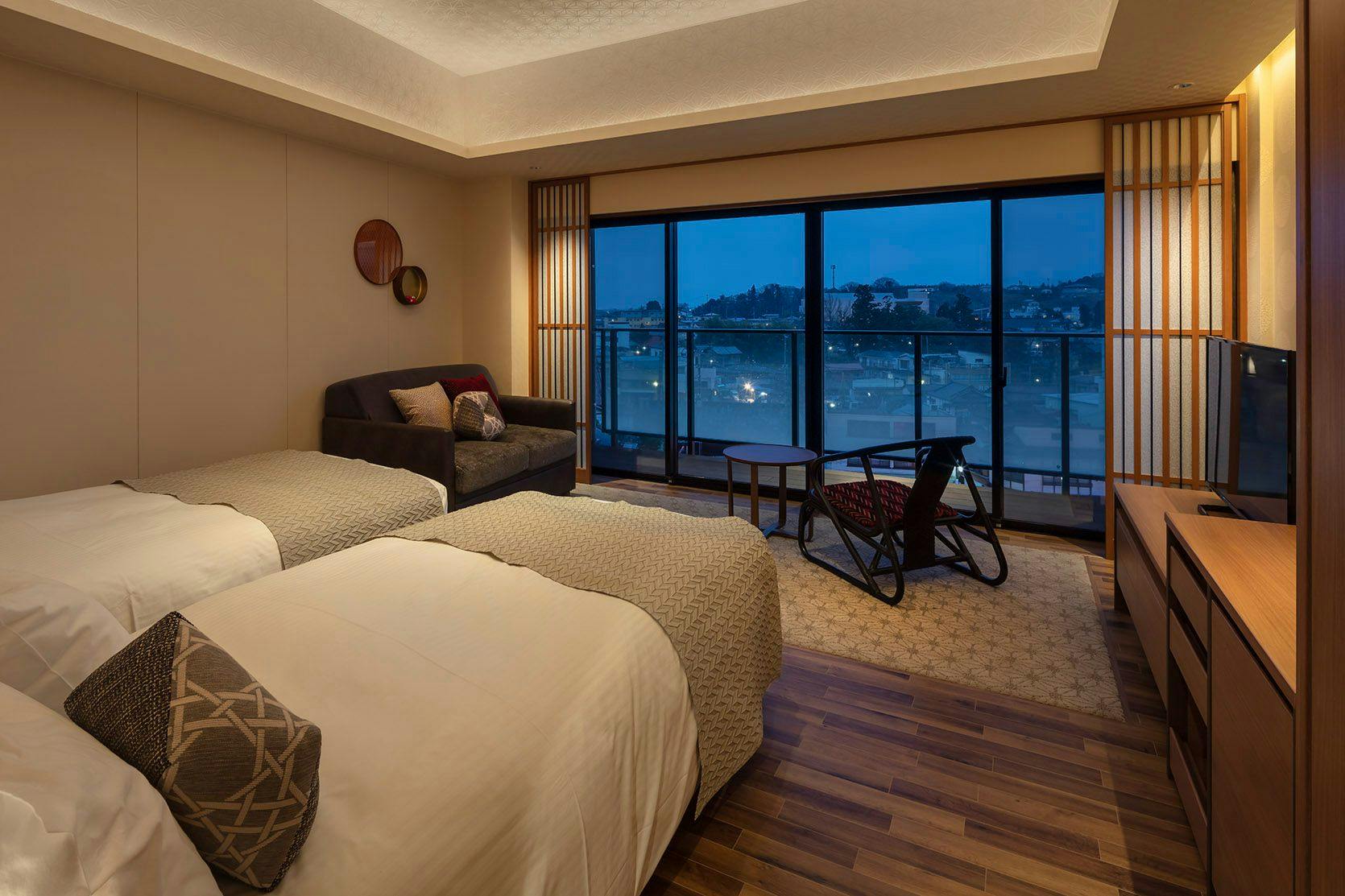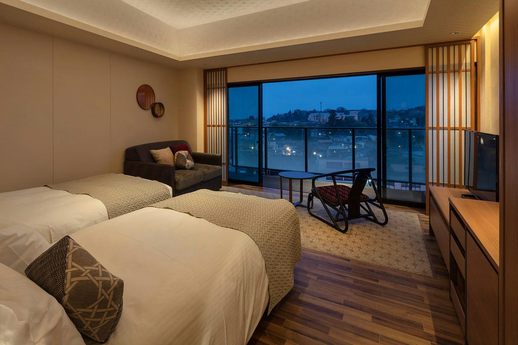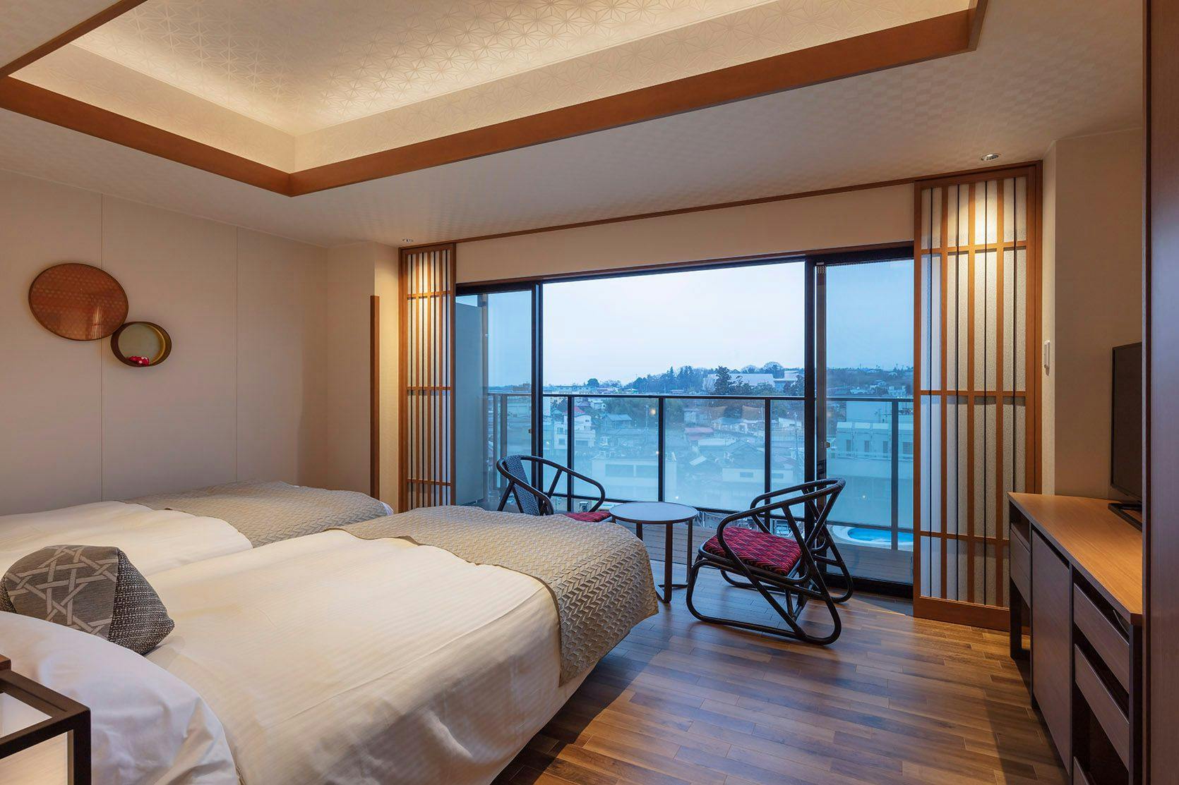 少人数での旅行にちょうど良いツインルームです。バルコニーに面した開放的なガラス扉からは雄大な山々と飯坂の街並みが一望でき、間取りよりも広々とした空間に感じられます。