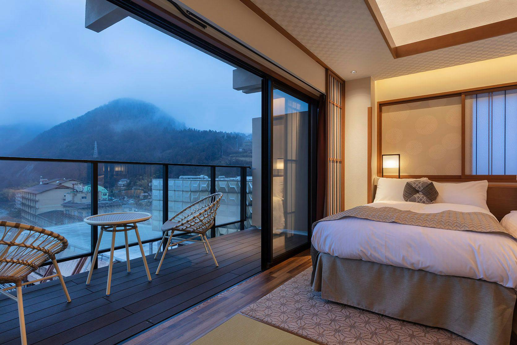 飯坂の山並みと摺上川の流れを見下ろす角部屋。東北伝統工芸と和モチーフをちりばめた内装と空を見渡せる大きな窓からの景色でお寛ぎください。川沿いに面したビューバスは、窓を開ければ浴槽から川のせせらぎもお楽しみいただけます。