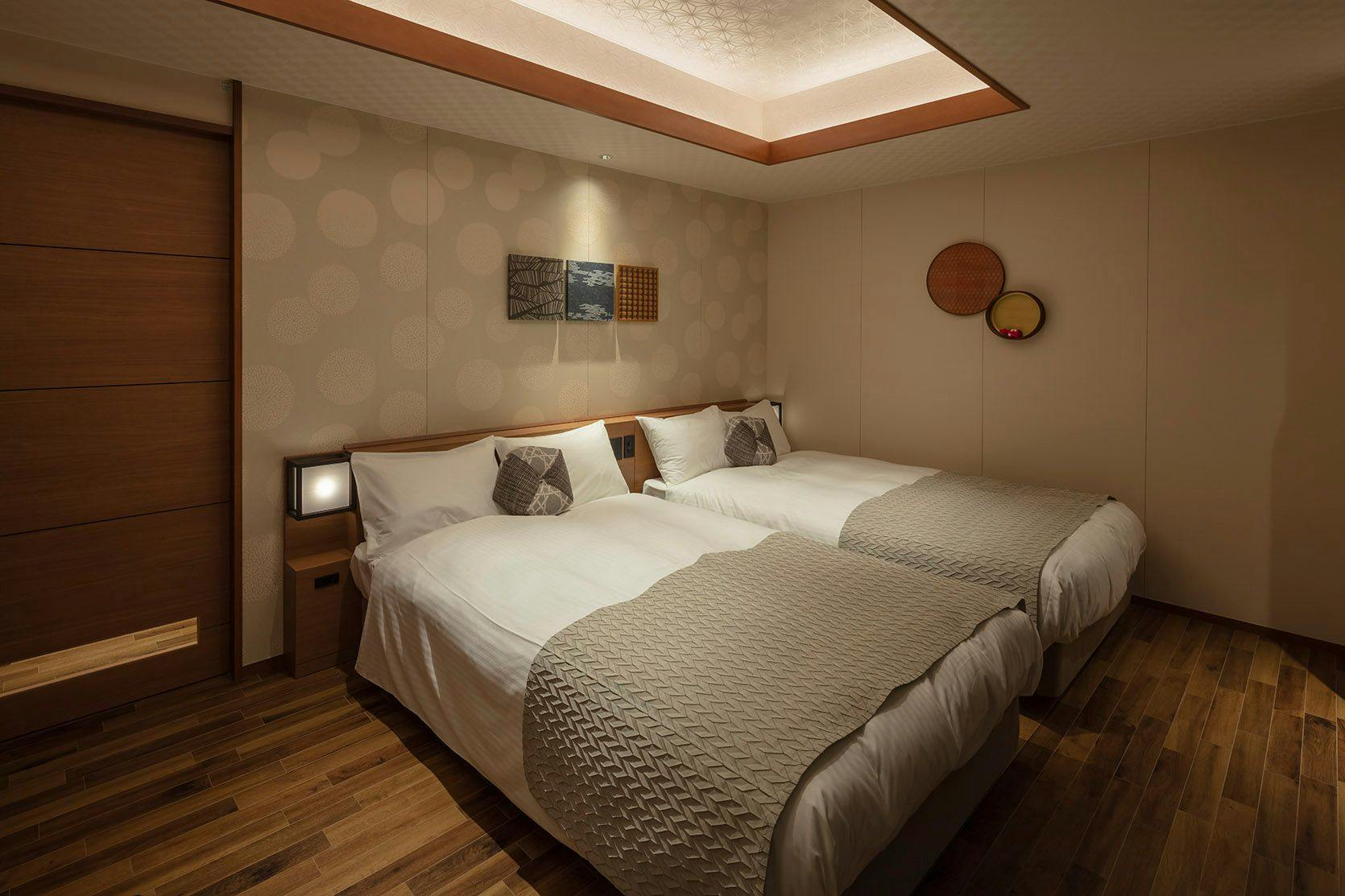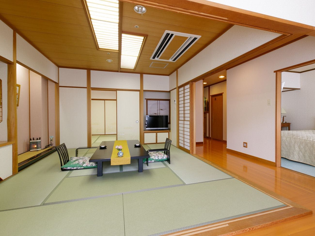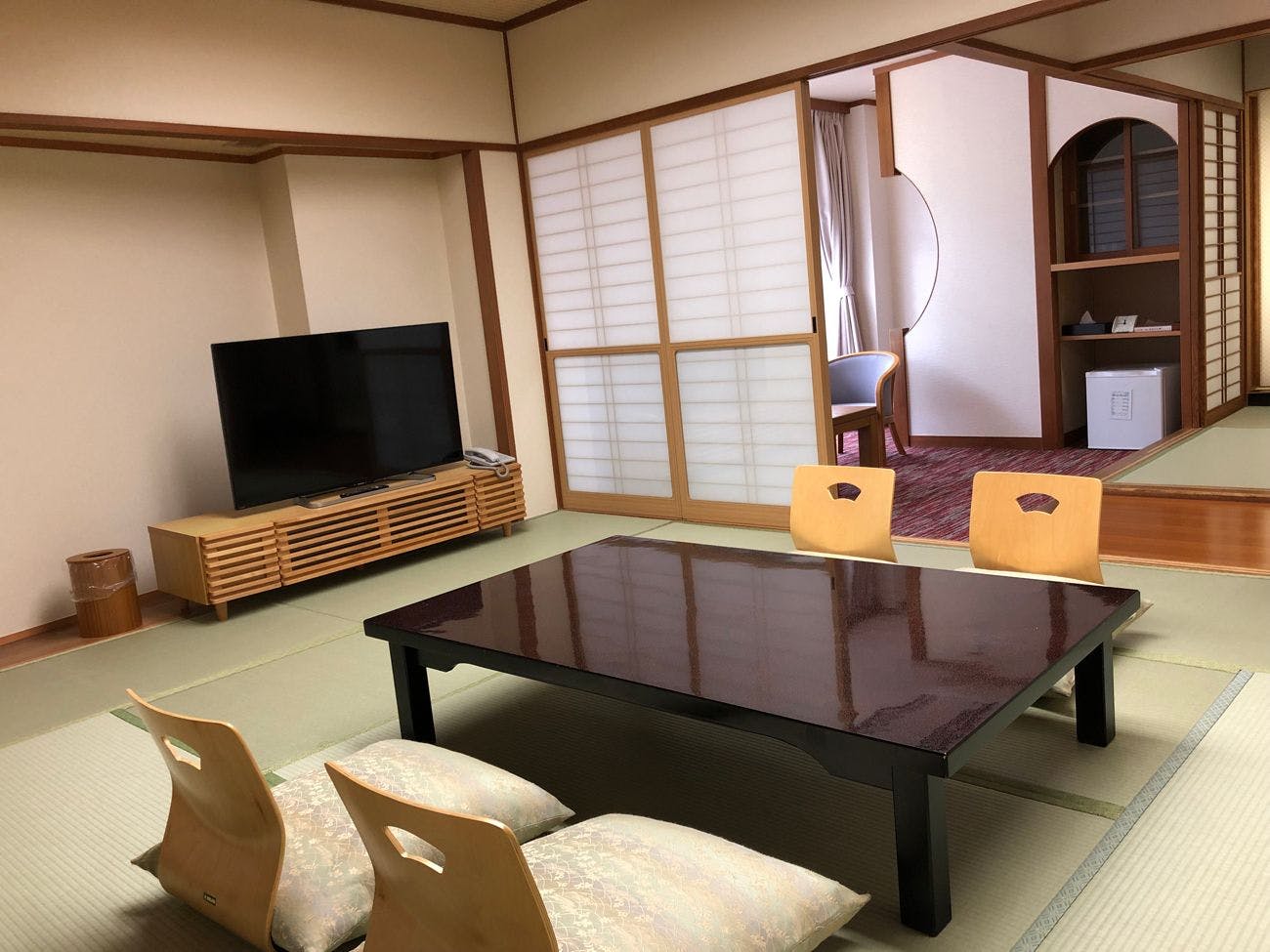 12畳に6畳の次の間付き、さらにベッドルーム(ツイン)のひろびろ和洋室!※7名定員当館のベッドは全室シモンズ社製を導入■禁煙室(おタバコはご遠慮下さいませ)■ベッドルームは個室の和洋室タイプ■ウォッシュレット完備■広縁にイス・テーブルも有ります■空気清浄機完備【喫煙者の方へ】館内共有スペースは禁煙です。喫煙は8階「喫煙ブース」をご利用下さい。