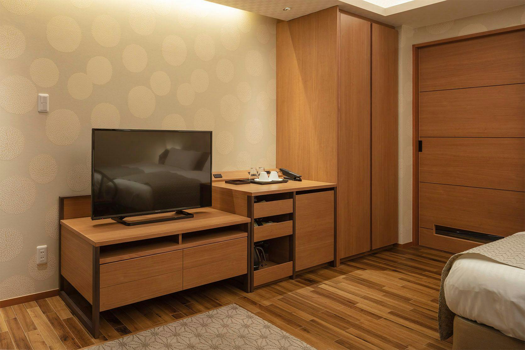 風情ある飯坂の街並を見渡す角部屋。スタイリッシュでありながらレトロな飯坂を感じられる内装はどこか懐かしさも感じられるます。ビューバスからの景色はまた違った表情をみせ、浴槽に寝そべると心地良い空を窓から眺める事ができます。