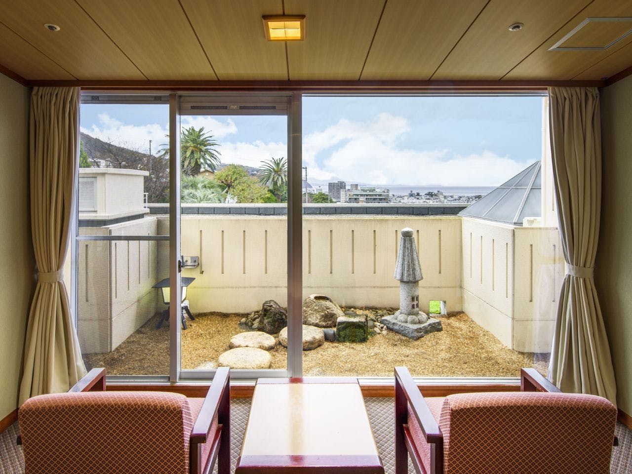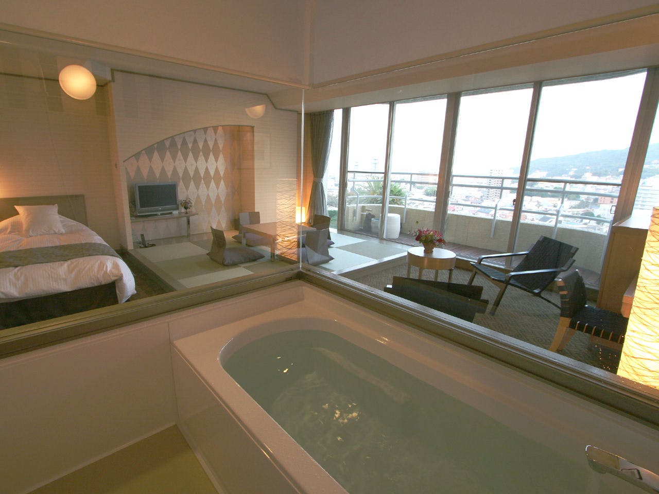 足湯のせせらぎと風薫る和洋室伊東のやわらかい日差し、さわやかな風、あなたをきっと癒してくれることでしょう。景色を眺めながらのご入浴が何度でも可能です。