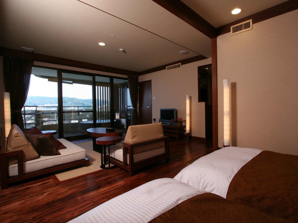 海が見える和洋室最上階の11階、高層階は10階、9階、通常和洋室は8階~5階にございます。玄関から入り右手にツインベットルーム。奥には和室が10畳間。