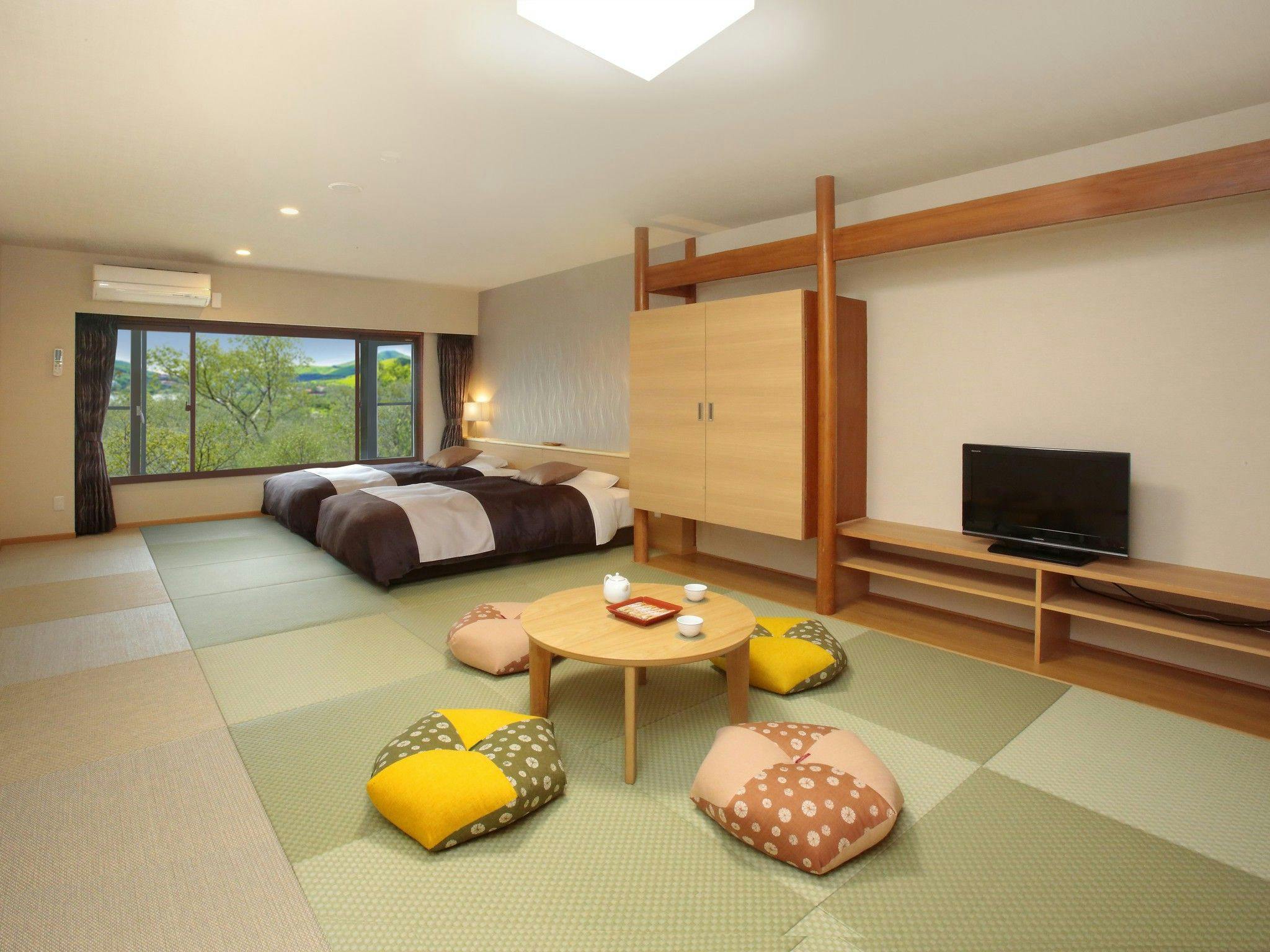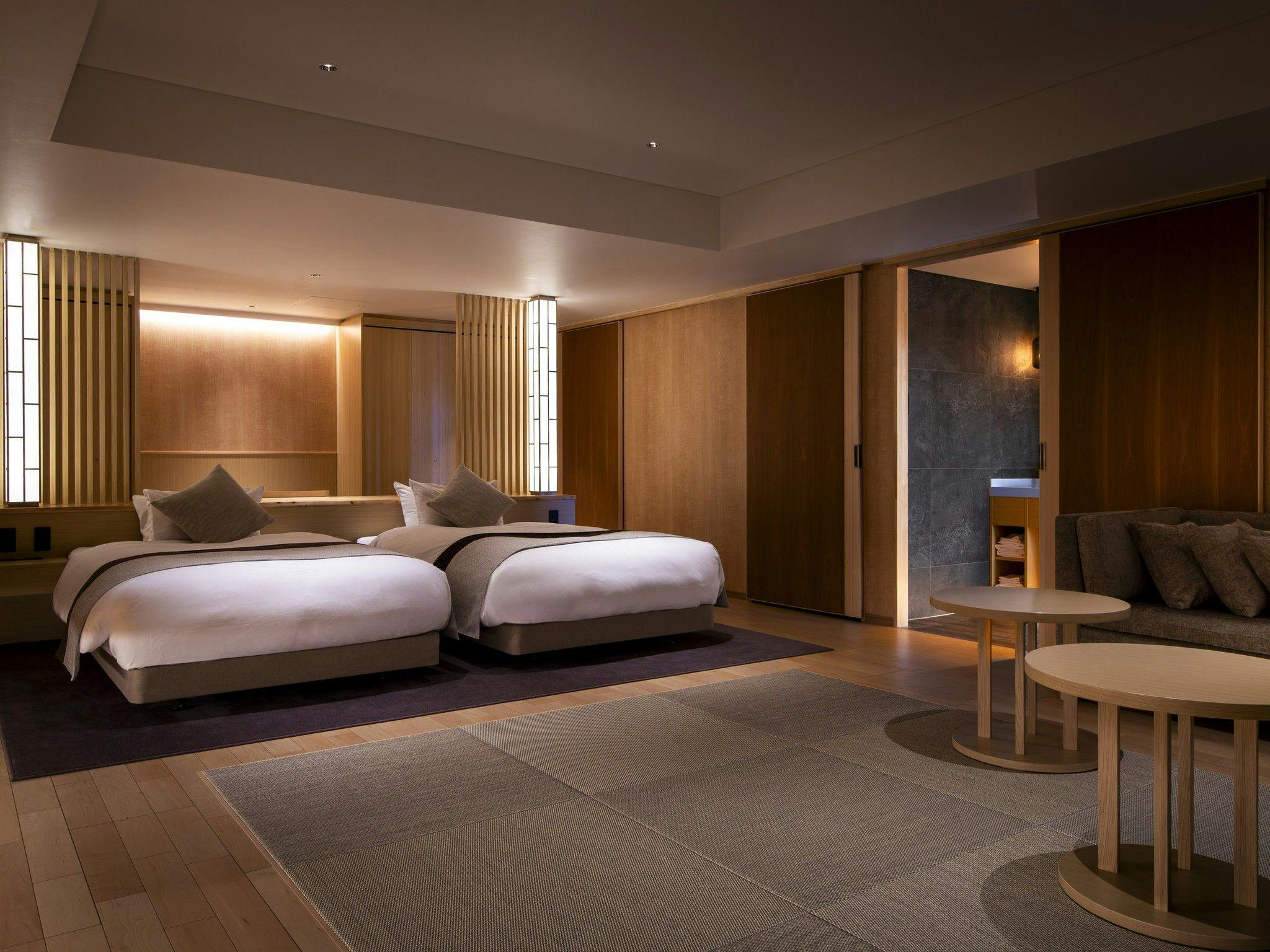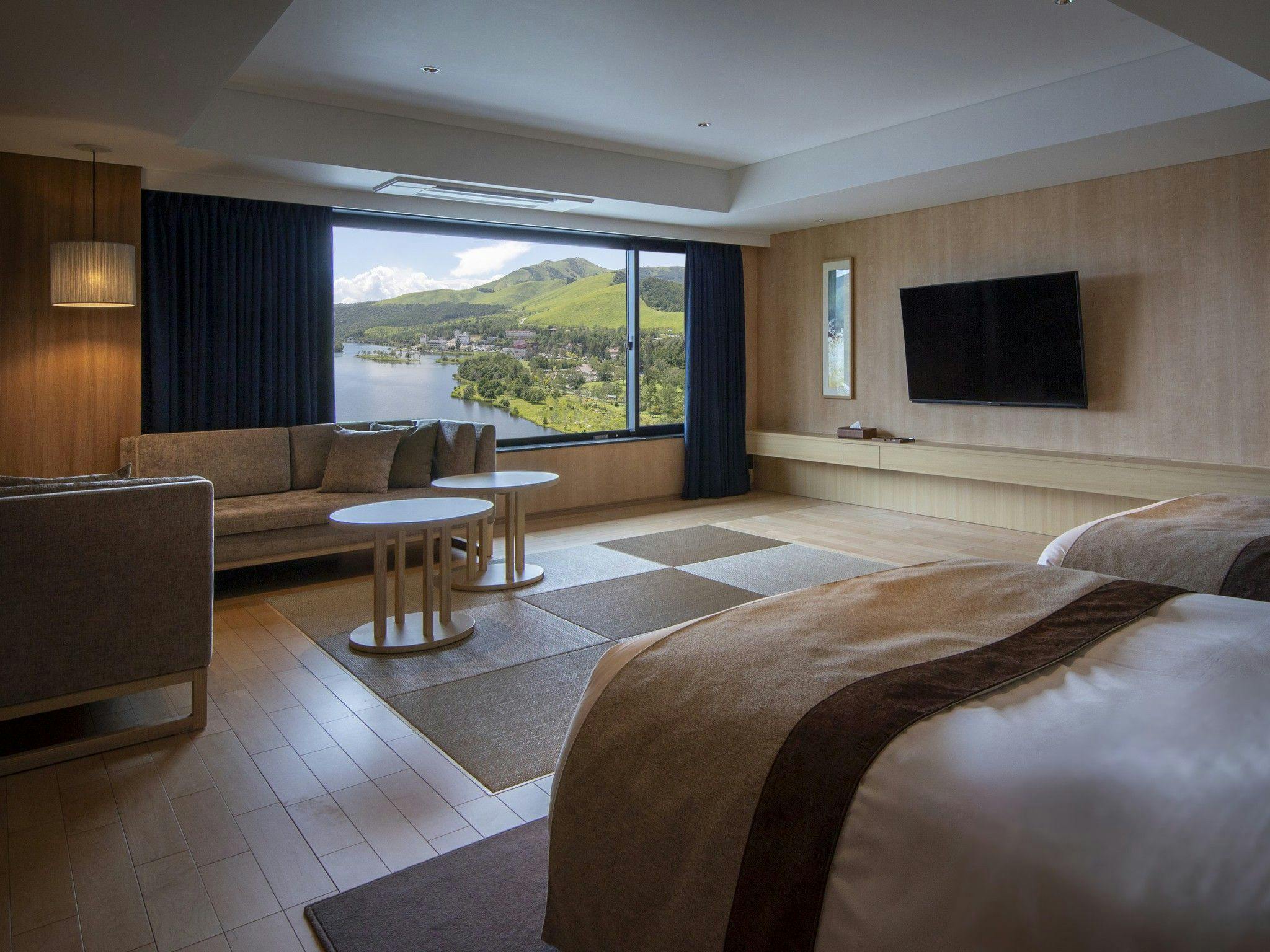 畳にベッドのモダンスタイル。新本館10階のコーナースイート、エクセルルーム。