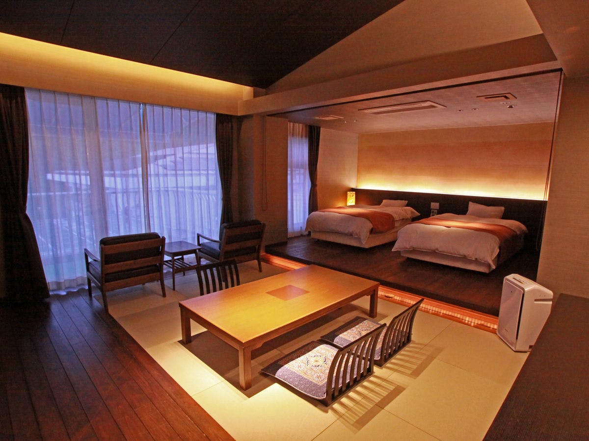 2021年に誕生した新客室。広々とした和室とベッドルームが一つになった特別室です。シャワーブースもあり、ウッドテラスには源泉かけ流しの「ひのき風呂」があり、温泉を24時間いつでもご利用頂けます。3名様以上の場合は和室にお布団を敷かせて頂きます。