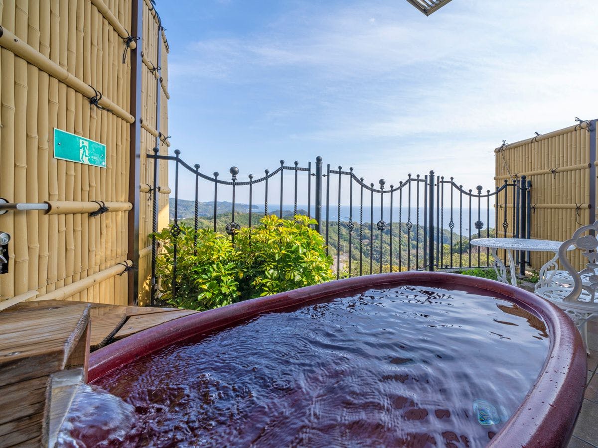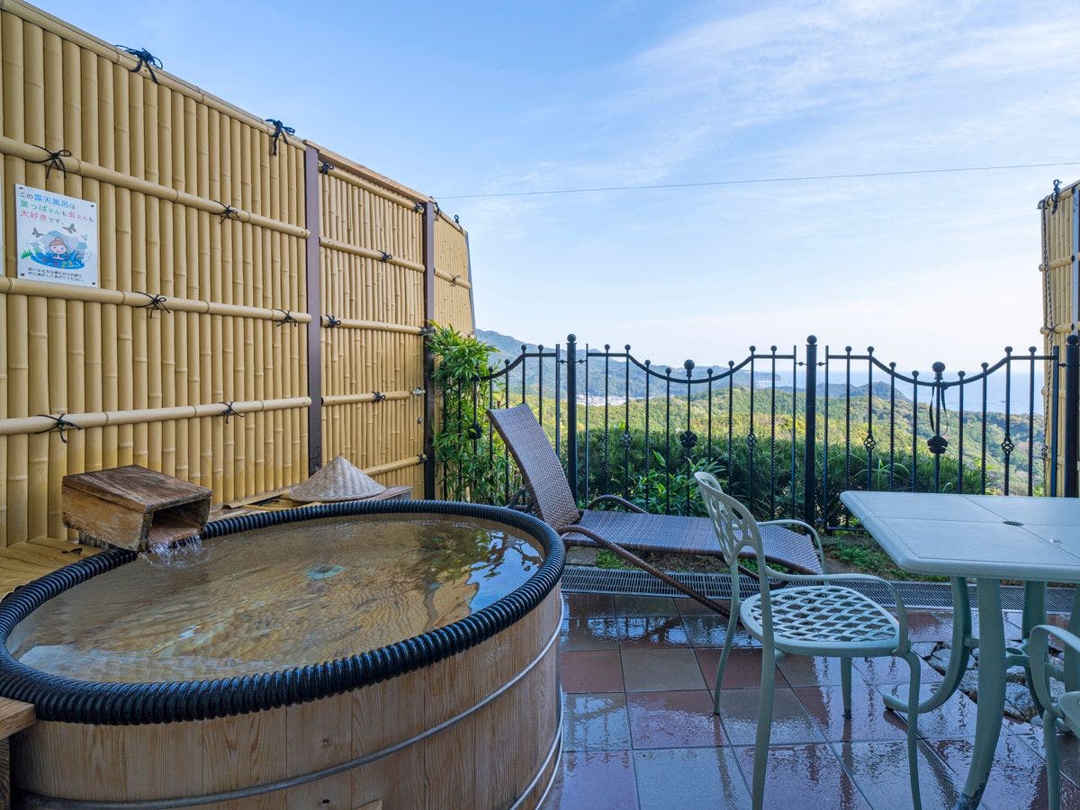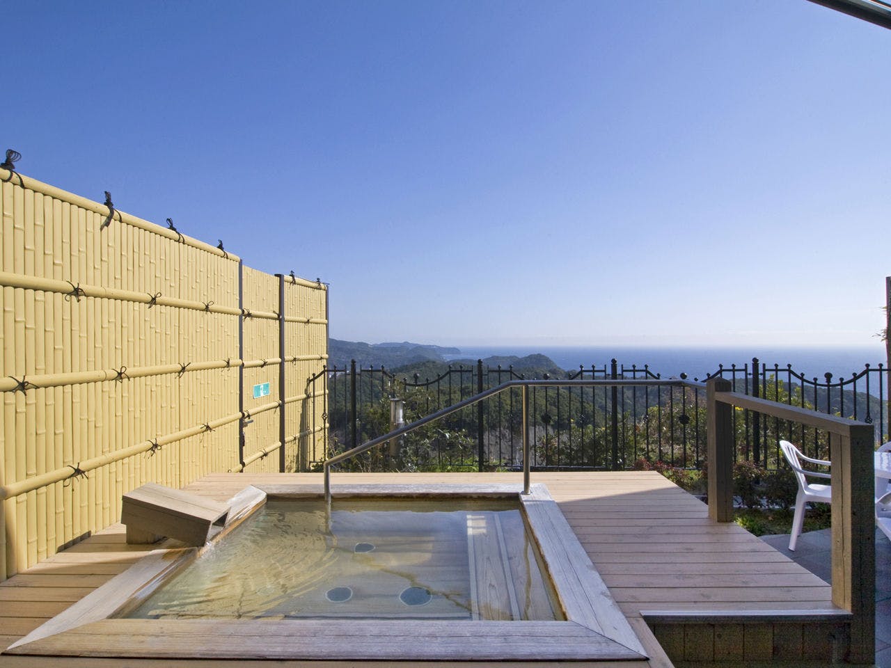 広々とした和室+洋室ツインベッド+源泉かけ流しの露天風呂がついております。2名様~6名様まで対応。高台から山々と太平洋の水平線を望む抜群の眺望!夜は満点の星空と共に温泉を楽しめます。