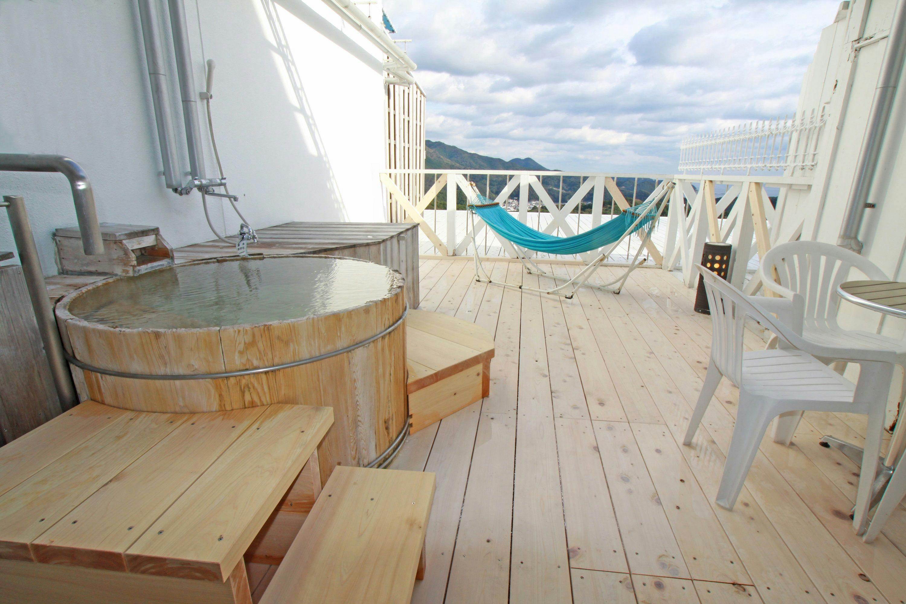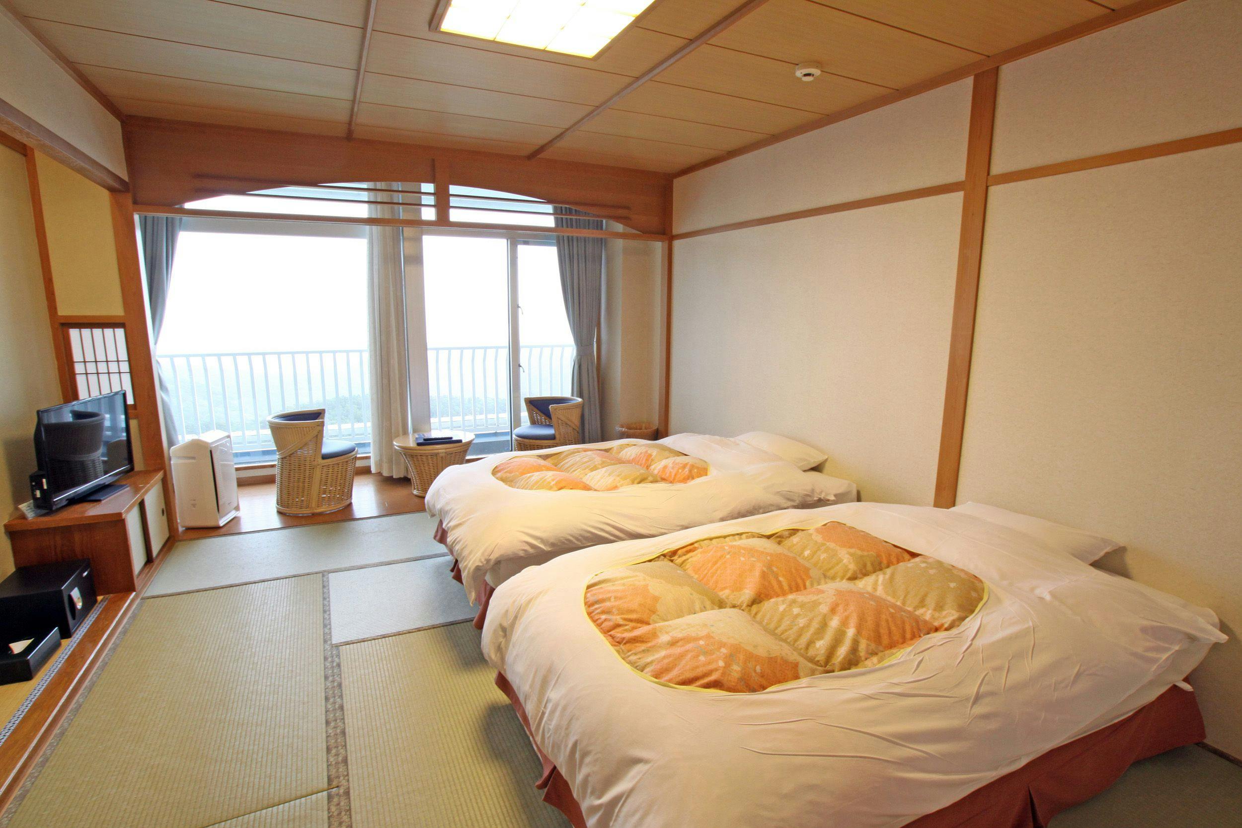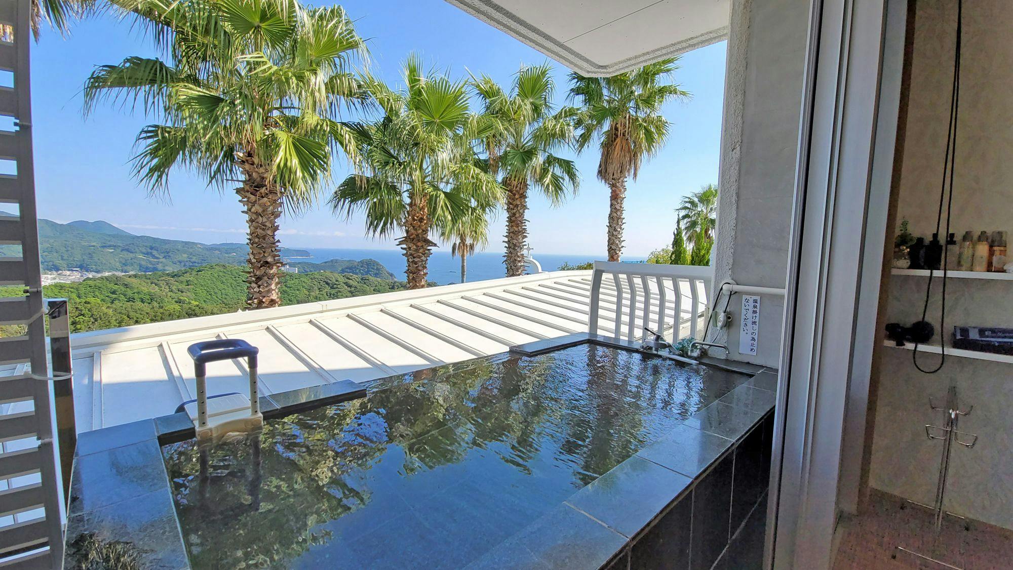 広々とした和室+洋室ツインベッド+源泉かけ流しの露天風呂がついております。2名様~6名様まで対応。高台から山々と太平洋の水平線を望む抜群の眺望!夜は満点の星空と共に温泉を楽しめます。