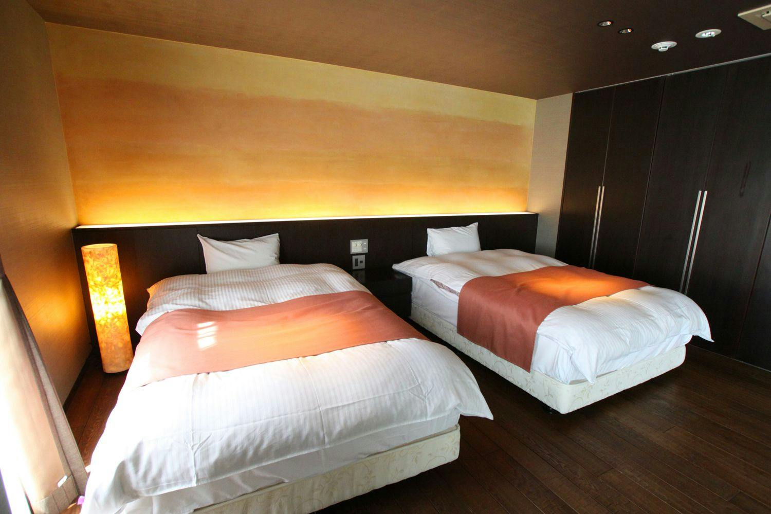 お部屋はブラウン色に統一された6名様定員・ゆったりとした客室でベッドルーム、和室に分かれています。ベッドルームの壁は「原左官工藝」による枯木灘海岸を染める夕焼けをイメージした左官アートでさまざまな南紀の土を配合し、この土地にちなんだ素晴らしいアート作品です。2名様までベッドルーム、それ以上は和室にてお布団を敷かせて頂きます