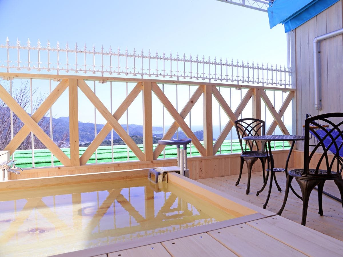 眺望のよいガラス貼りの洋室と、 お庭には大きな露天風呂と眺望を楽しむデッキ。カップルで、ご夫婦でゆったりおくつろぎ頂ける最高の空間をご用意いたしました。プライベートを保ちつつ、景観に重点をおいた広い庭の露天風呂。1部屋限定の特別なお部屋ですのでご予約はお早めに室内にはケージをご用意しており、小型犬(5キロ程度)のみ対象となります ワンちゃんが一匹増える場合は1,650円、ケージ追加の場合も2,200円頂いております。客室以外はペット不可となります。