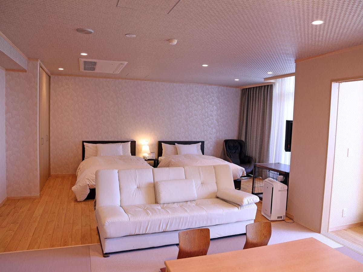 お部屋の眺望は和室に劣ります。バストイレ付です。3名様の場合は追加ソファーベッドでご利用できます。