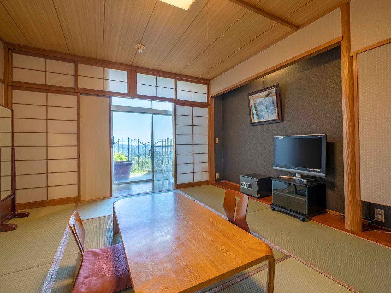 高台から山々と太平洋を一望する基本和室<Wi-Fi接続可>洗面所&全室ウオシュレット完備空の冷蔵庫有。飲み物持ち込みOK浴衣、タオル、バスタオル、湯足袋、歯ブラシセット有2021年より禁煙室での受付となります。