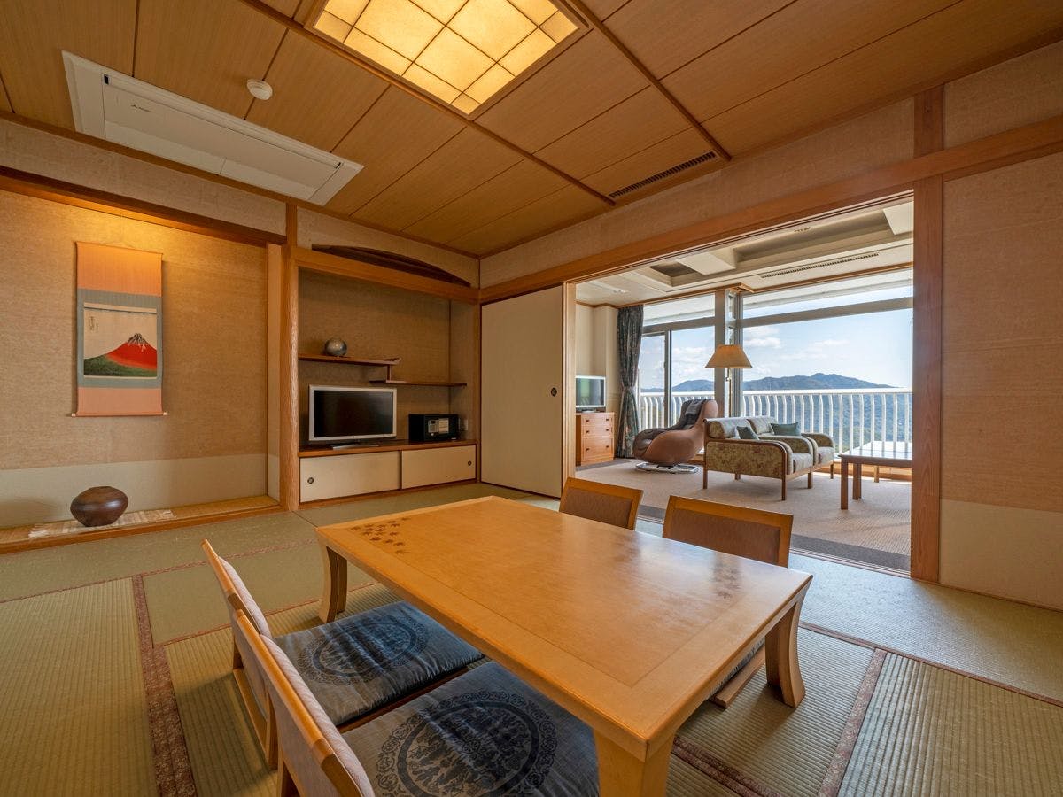 当ホテルに1部屋のみの特別和室です。 リビングルームから眺める、ホテルシンボルでもあるベルタワーと太平洋を見渡す最高の眺望がこのお部屋の魅力です。 もちろん内風呂からもこの絶景を楽しめるように作られており、落ち着いた雰囲気でご宿泊頂けます。