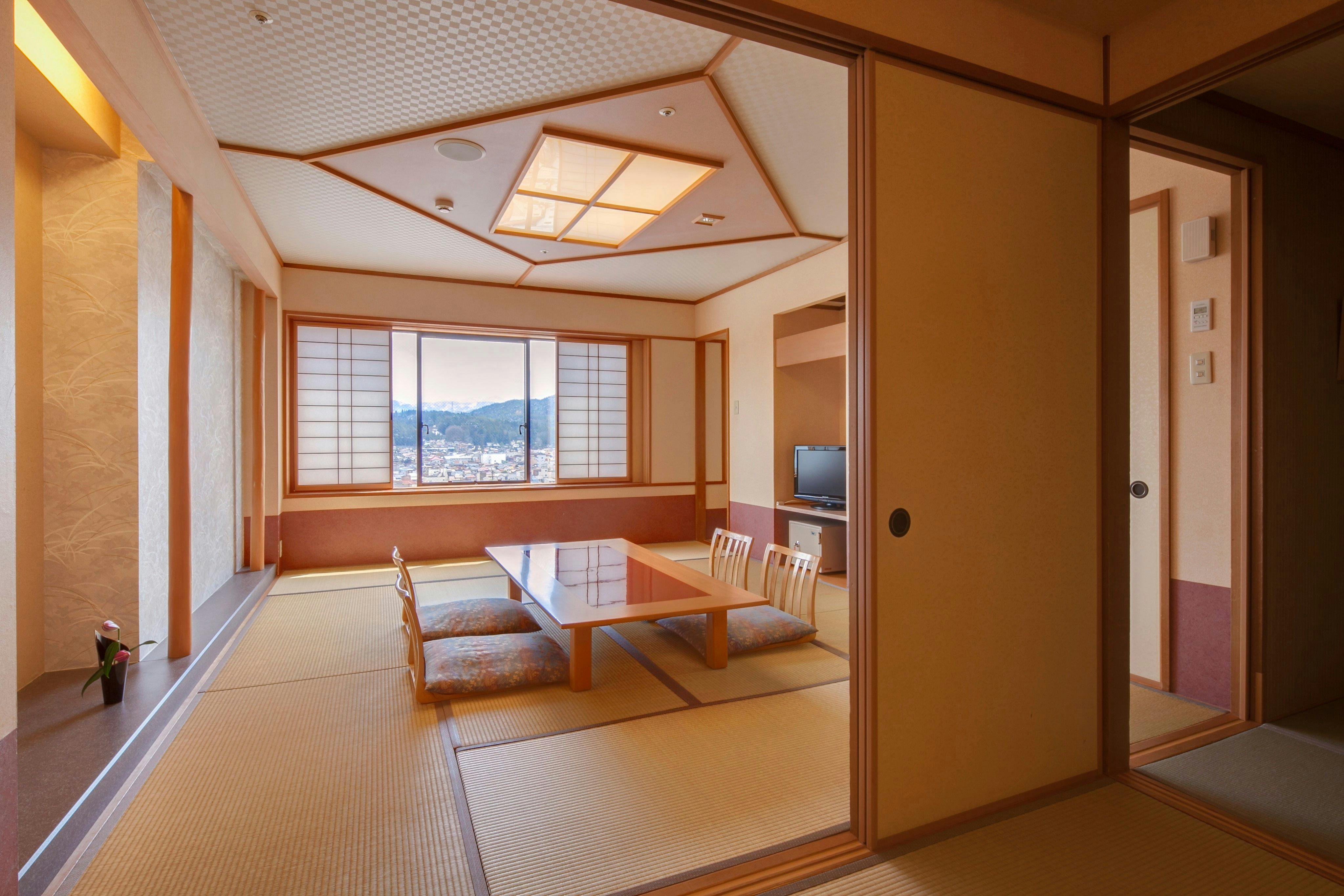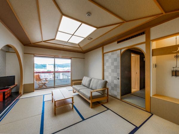 ・2間つづきの和室・次の間(4.5畳)には和ベッド2台・13階建皆美館タワー・8階以上での優雅な眺めのお部屋 ・最大定員6名様までご利用可能・バス・トイレはセパレートタイプ・温水洗浄付トイレ・インターネット 有線LAN・Wi-Fi完備・全室【禁煙】となります館内2箇所の温泉大浴場もご利用下さいお部屋着(甚平)でホテル内全てOKホテルであって旅館のお寛ぎを実感できます
