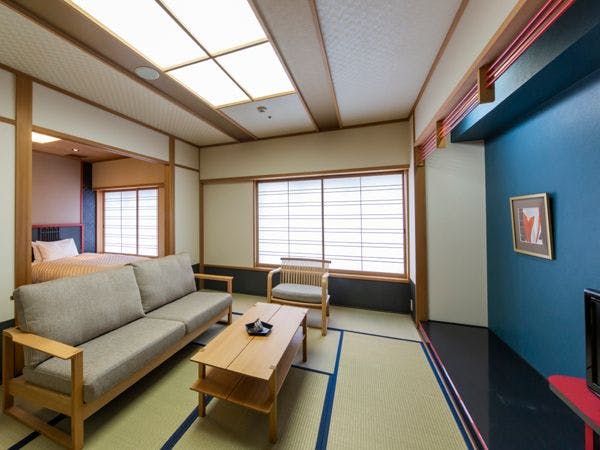 ・低めのソファーを備えた2間つづきの和室・次の間(6畳)にはシモンズ製ベッド2台・最大定員4名様までご利用可能・バス・トイレはセパレートタイプ・温水洗浄付トイレ・インターネット 有線LAN・Wi-Fi完備館内2箇所の温泉大浴場もご利用下さいお部屋着(甚平)でホテル内全てOKホテルであって旅館のお寛ぎを実感できます
