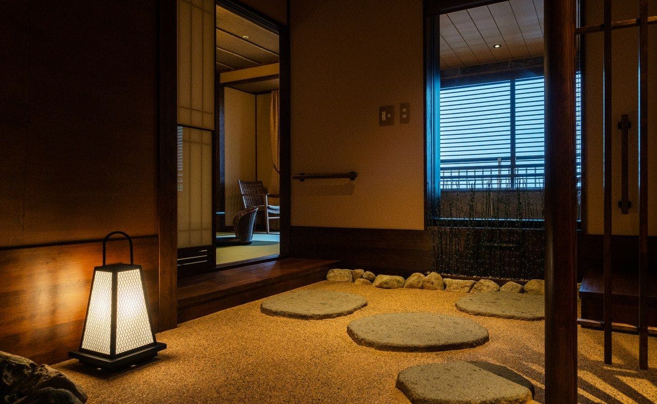 温泉露天風呂と坪庭がついた客室。内装も和モダンな内容で統一されてます全室Wi-Fi無料 禁煙
