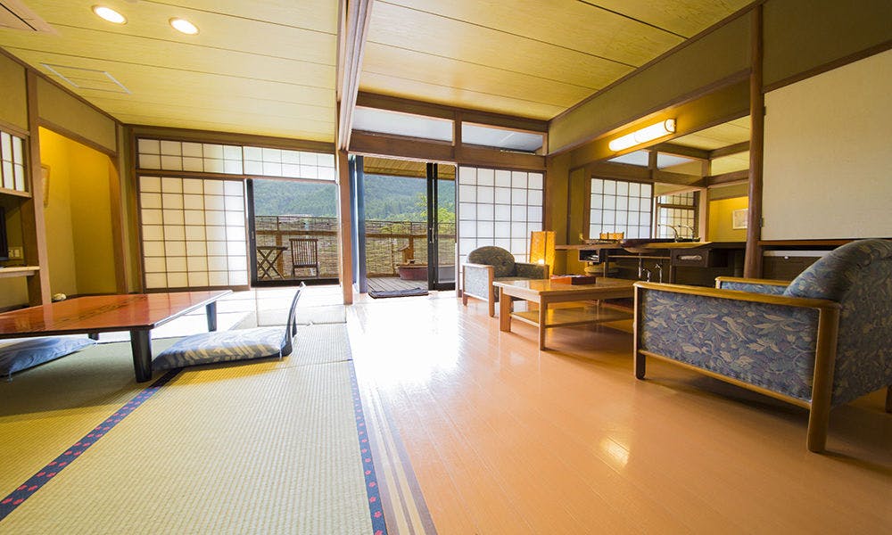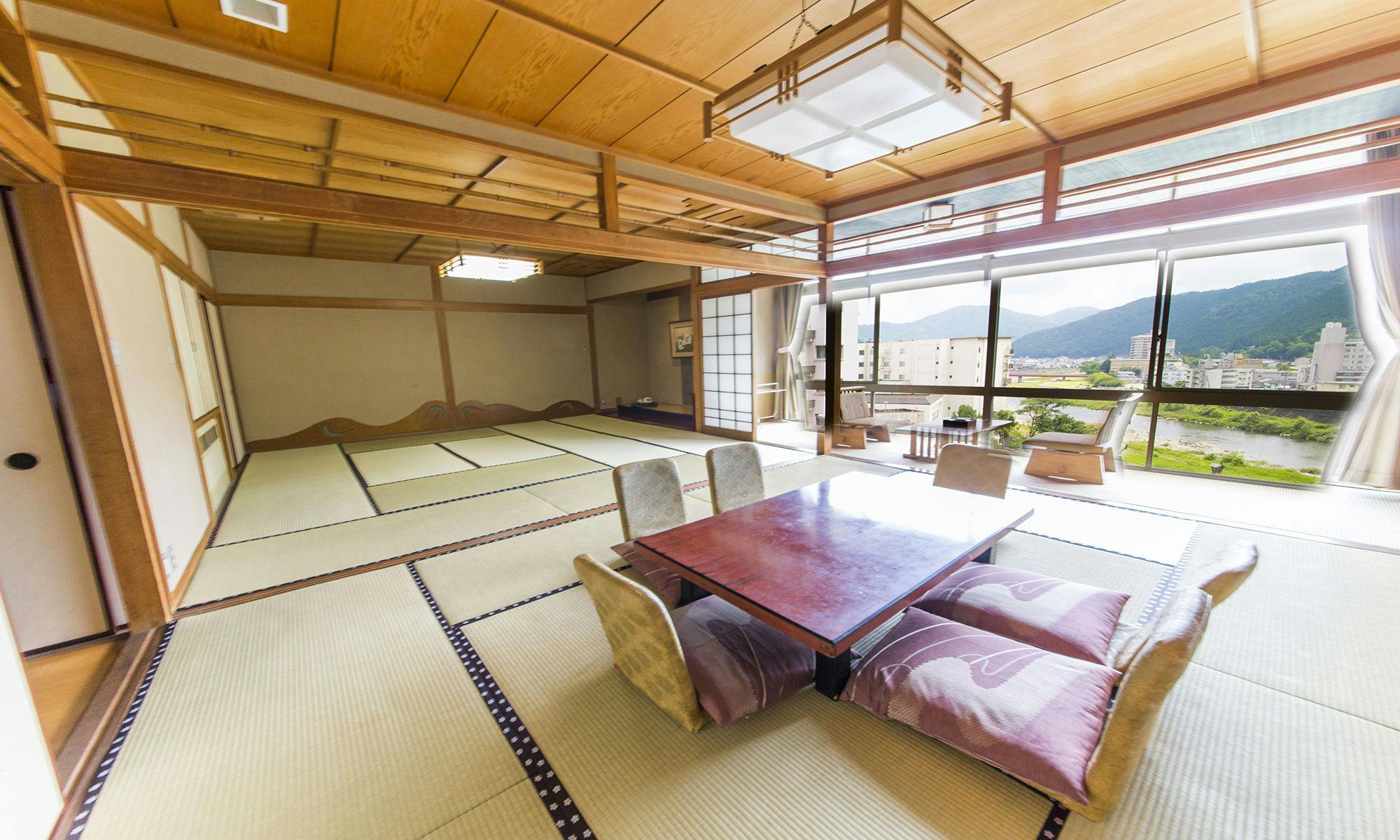 ご家族、仲間の大人数でも宿泊可能な大部屋。和室10帖+12.5帖の2間でご案内。2階-5階に各1部屋のみのご案内。飛騨川と望川館自慢の日本庭園を眺めながら、ゆっくりとお寛ぎ下さい。 WI-Fi環境全客室と1階ロビーにて無料でご利用頂けます。