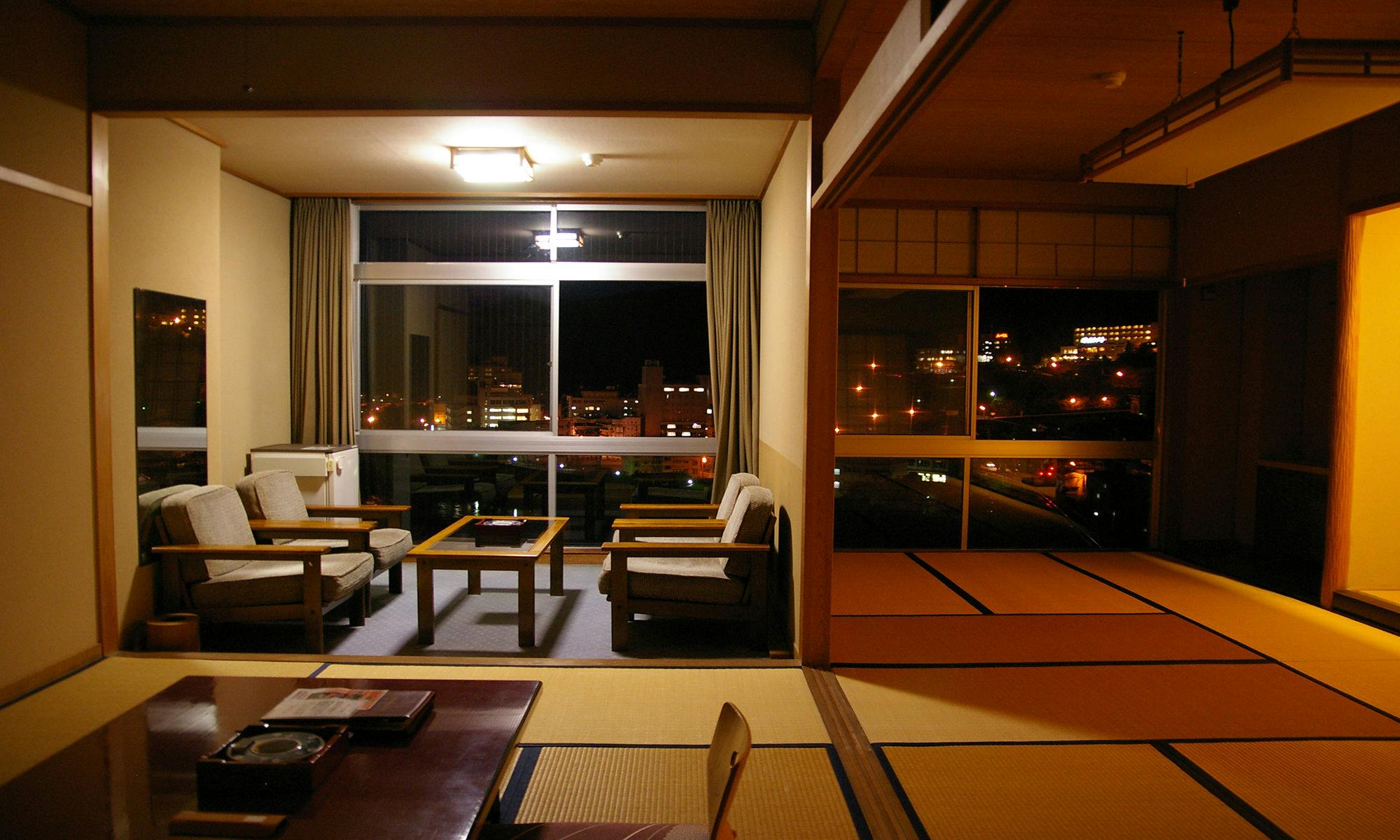 和室8帖間和室バス・トイレ(ウォッシャー付)付きテレビは、地デジ対応ドライヤー、バスタオル、フェイスタオル、浴衣、丹前 歯ブラシあり和の趣を持ちつつ落ち着いた雰囲気でご案内致します。景観は、山側になります。WI-Fi環境全客室と1階ロビーにて無料でご利用頂けます。