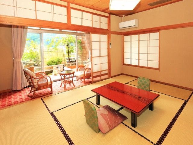 ・一般和室10帖のお部屋になります。・川側、日本庭園側のお部屋になります。望川館全客室の中で、リーズナブルにご案内できる稼働率NO1のお部屋。景色も楽しめ落ち着きを感じられる和室になりますトイレ【ウォッシャー付】+ユニットバス付。TVも35インチ・地デジ対応。WI-Fi環境全客室と1階ロビーにて無料でご利用頂けます。