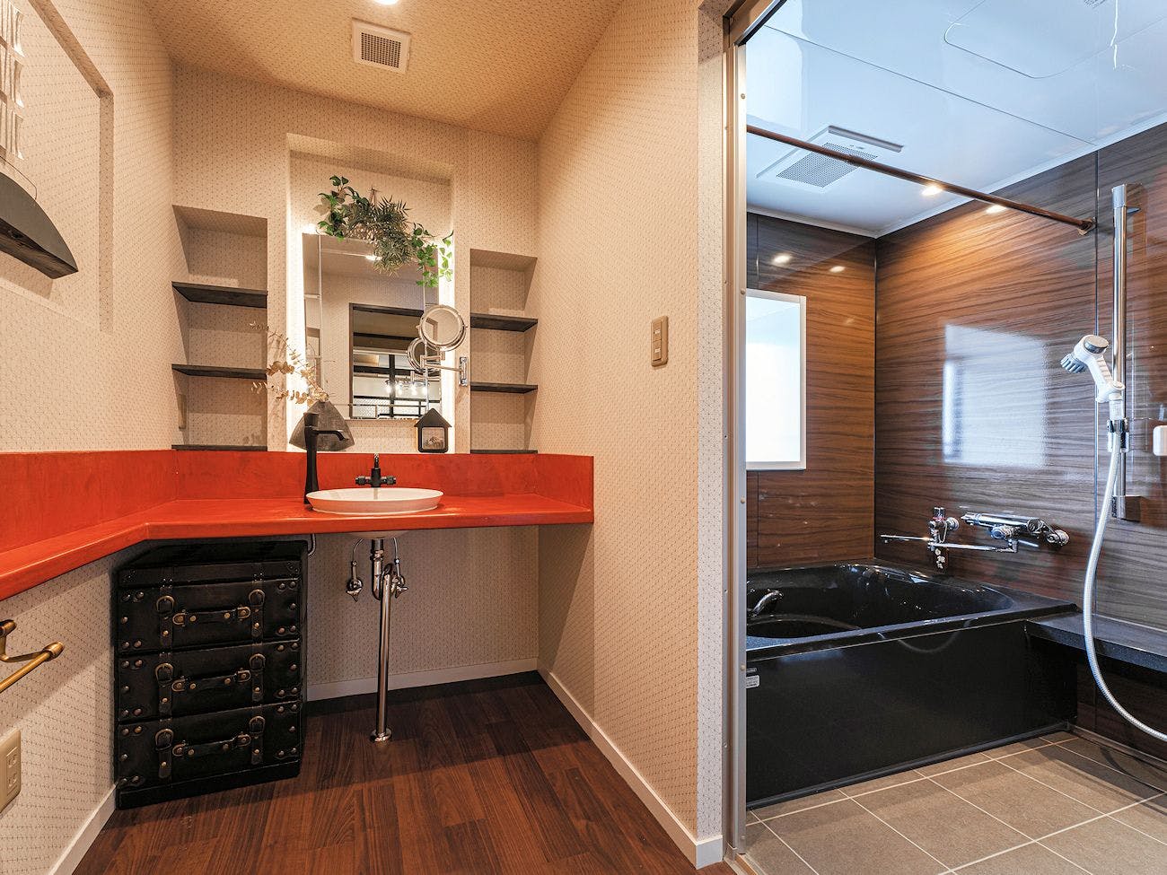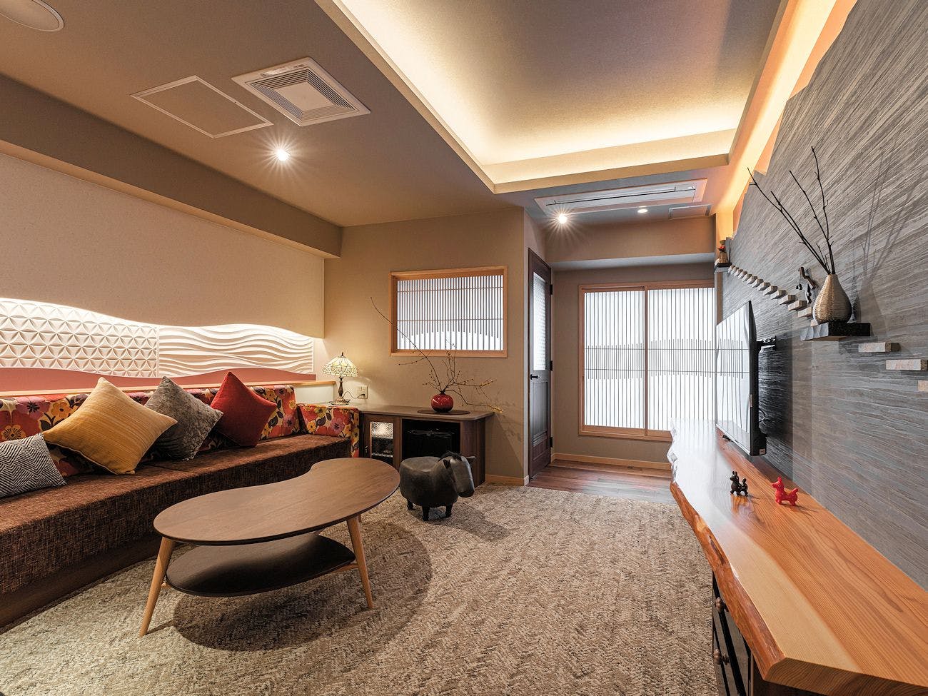 ヒノキのお風呂とトイレを備えた洋室です。お風呂は温泉ではありません。ヒノキ風呂の一部がガラス張りになっていて伊香保の街並みが望めます。洋室をベースに琉球畳を配置した和モダン雰囲気のお部屋です。座り心地の良い椅子とテーブルでごゆっくりお過ごしください。