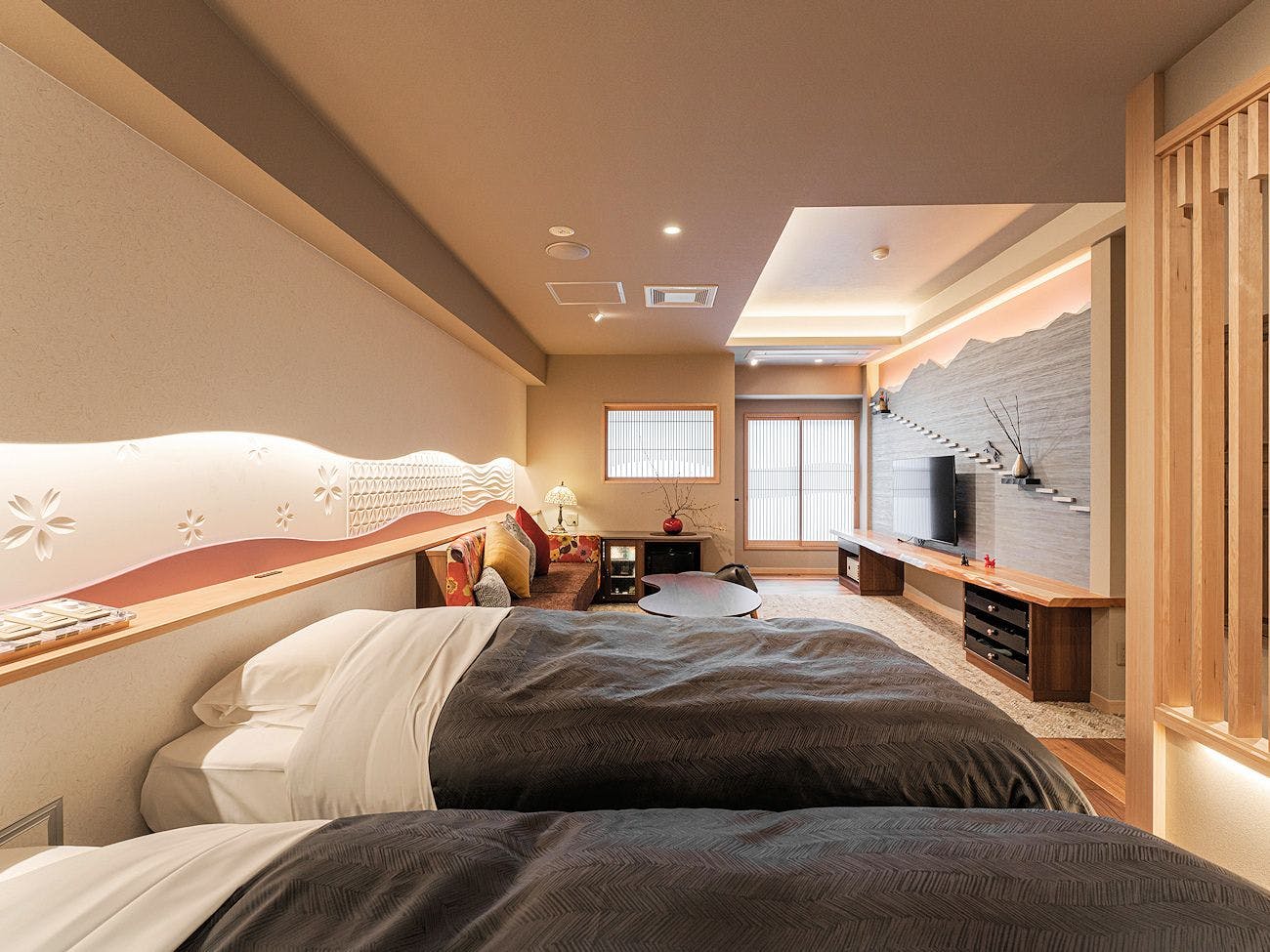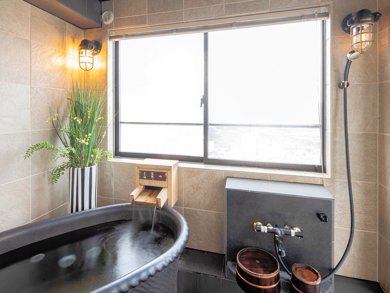 こちらは喫煙のお部屋です。ヒノキのお風呂とトイレを備えた和洋室です。お風呂は温泉ではありません。ヒノキ風呂の一部がガラス張りになっていて伊香保の街並みが望めます。「和」のやすらぎと、スタイリッシュな「洋」の雰囲気が混ざり合う和モダンな造りとなっております。