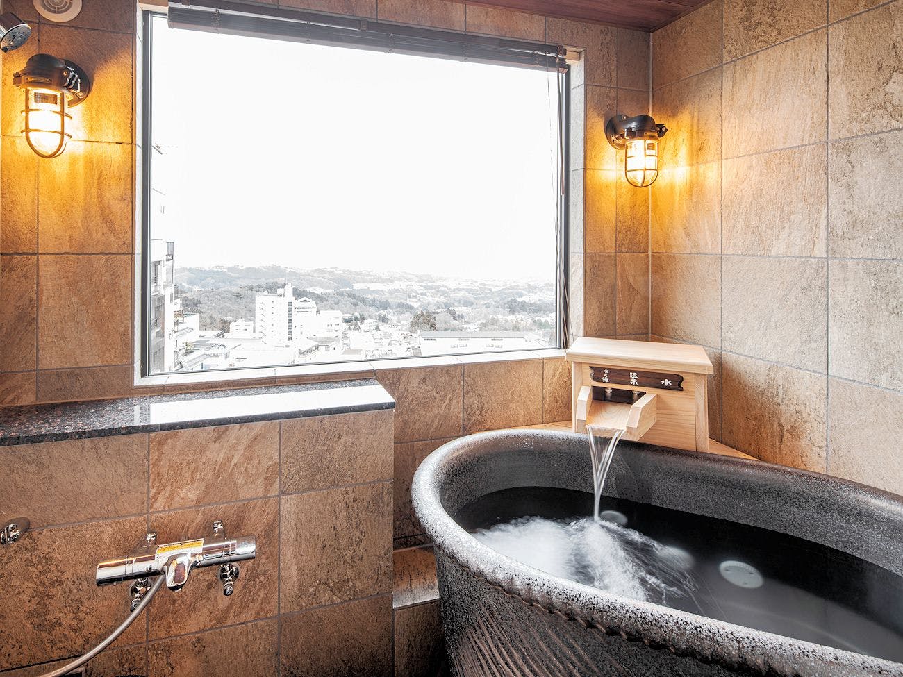 温泉付のお風呂とトイレを備えた客室です。2021年12月に改装いたしました。お部屋でゆっくりと温泉をお楽しみいただけます。窓から外を眺められるお風呂です。お食事は個室お食事処でご準備いたします。温泉付特別室に限り、0歳~小学生のお子様を含むご予約はお受けしておりません。