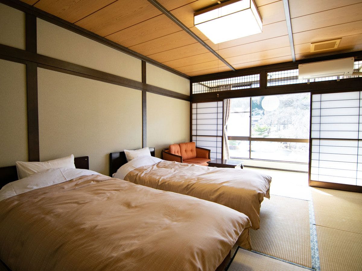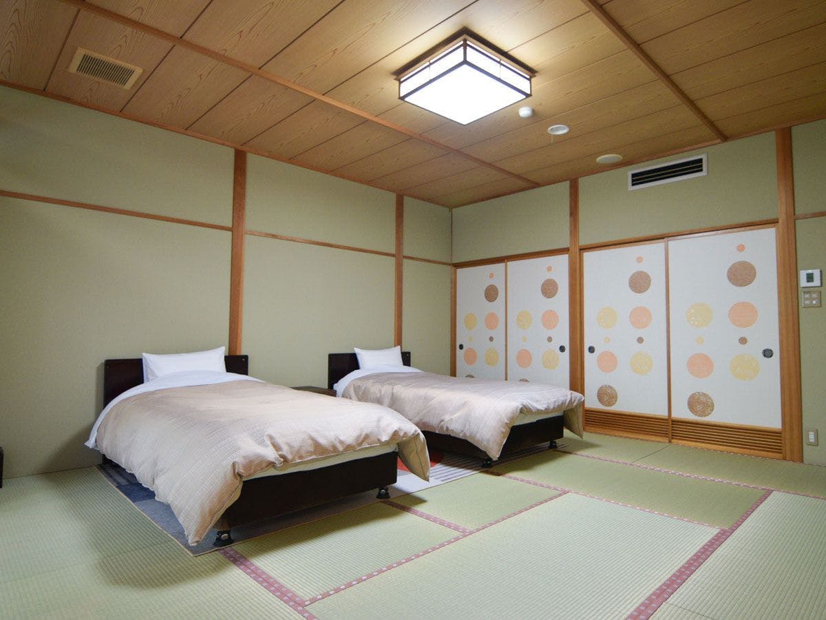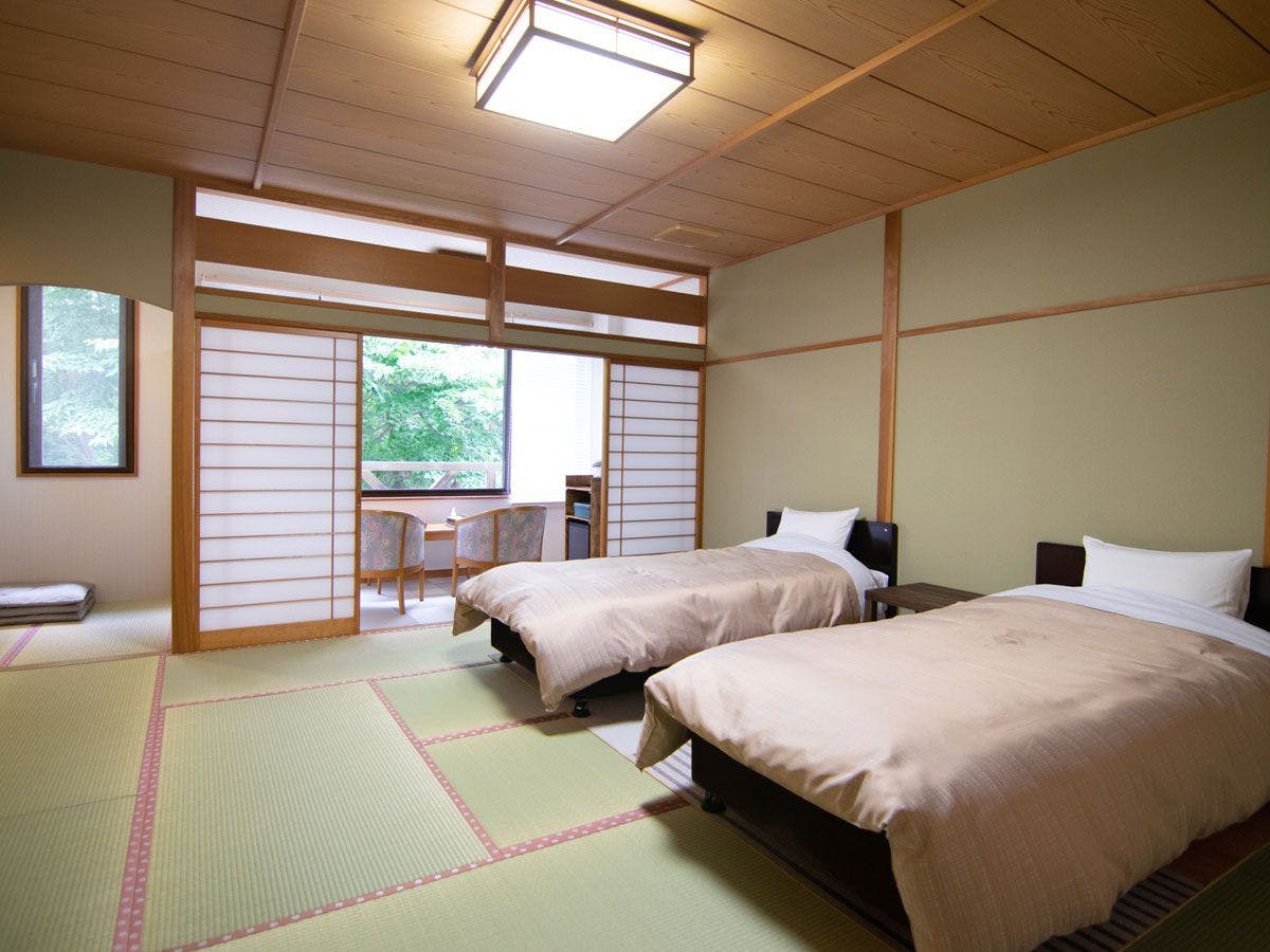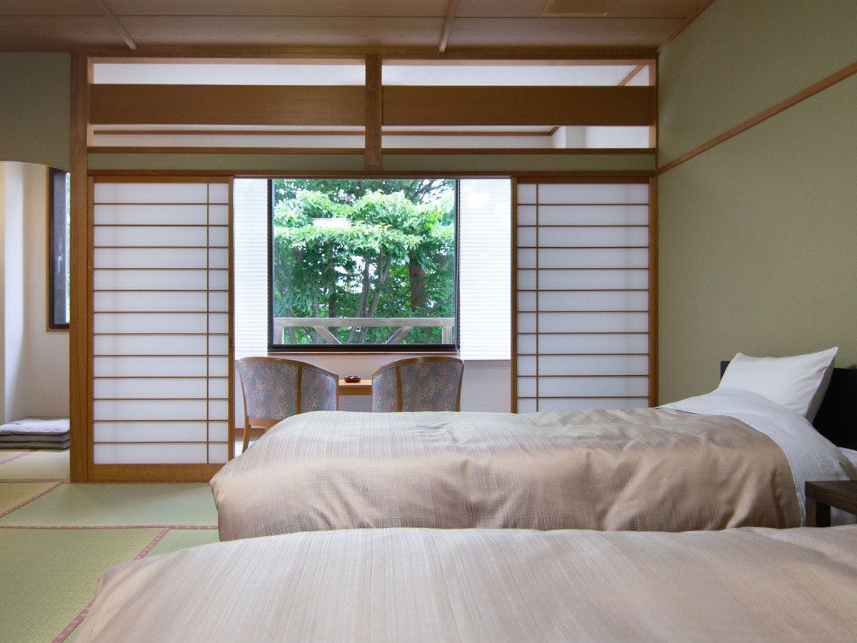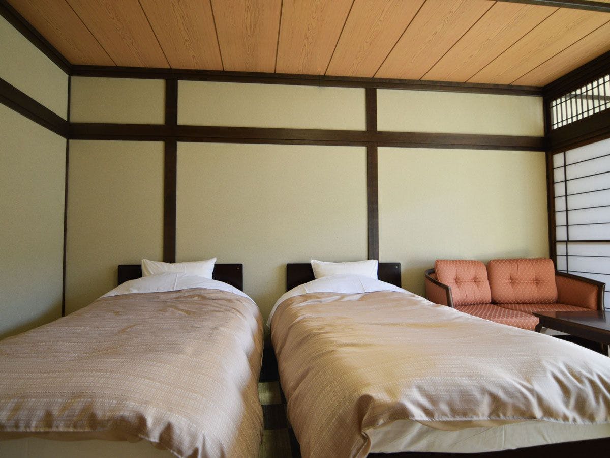 ゆったりと広めの和室に、ツインベッドを配したお部屋。