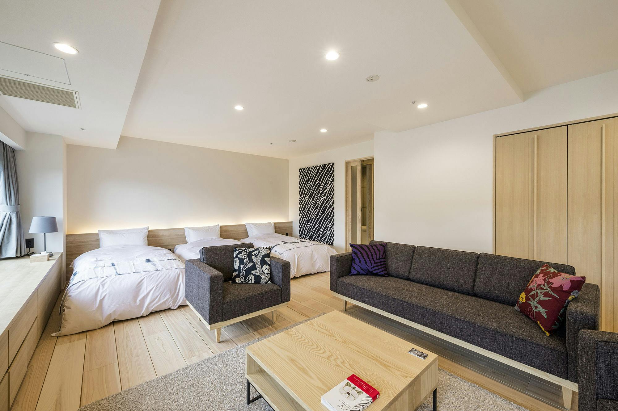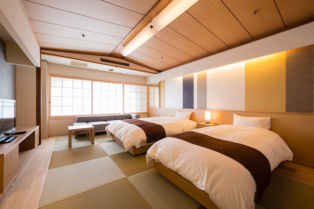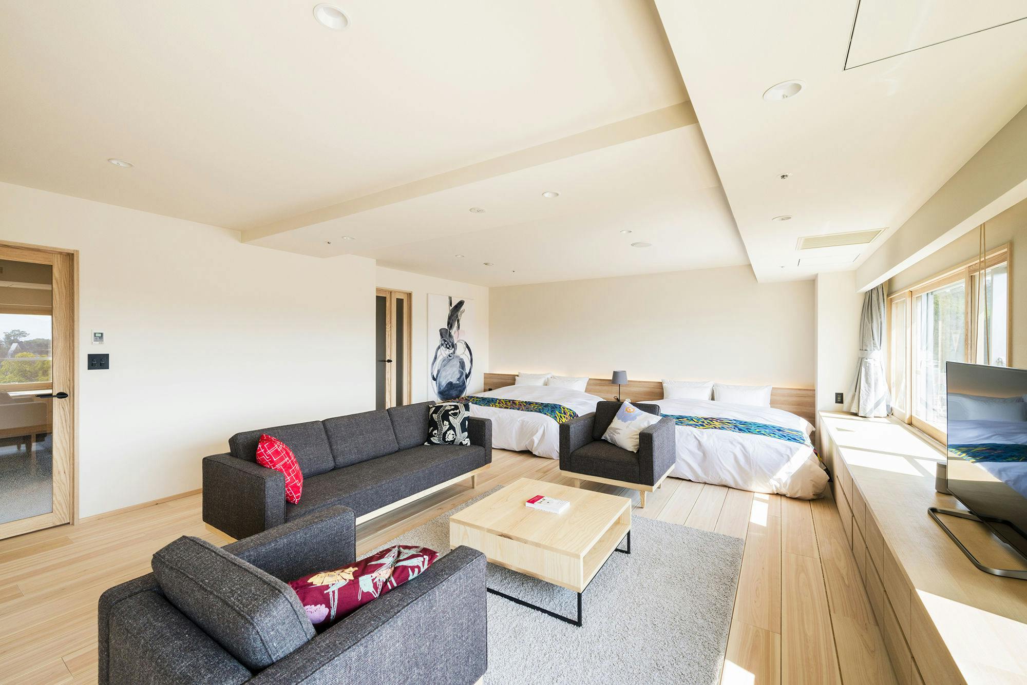 湯上りの足に優しいフローリングと畳の空間、清潔感を感じる明るい色調の木を使ったゆったりとしたベッド。