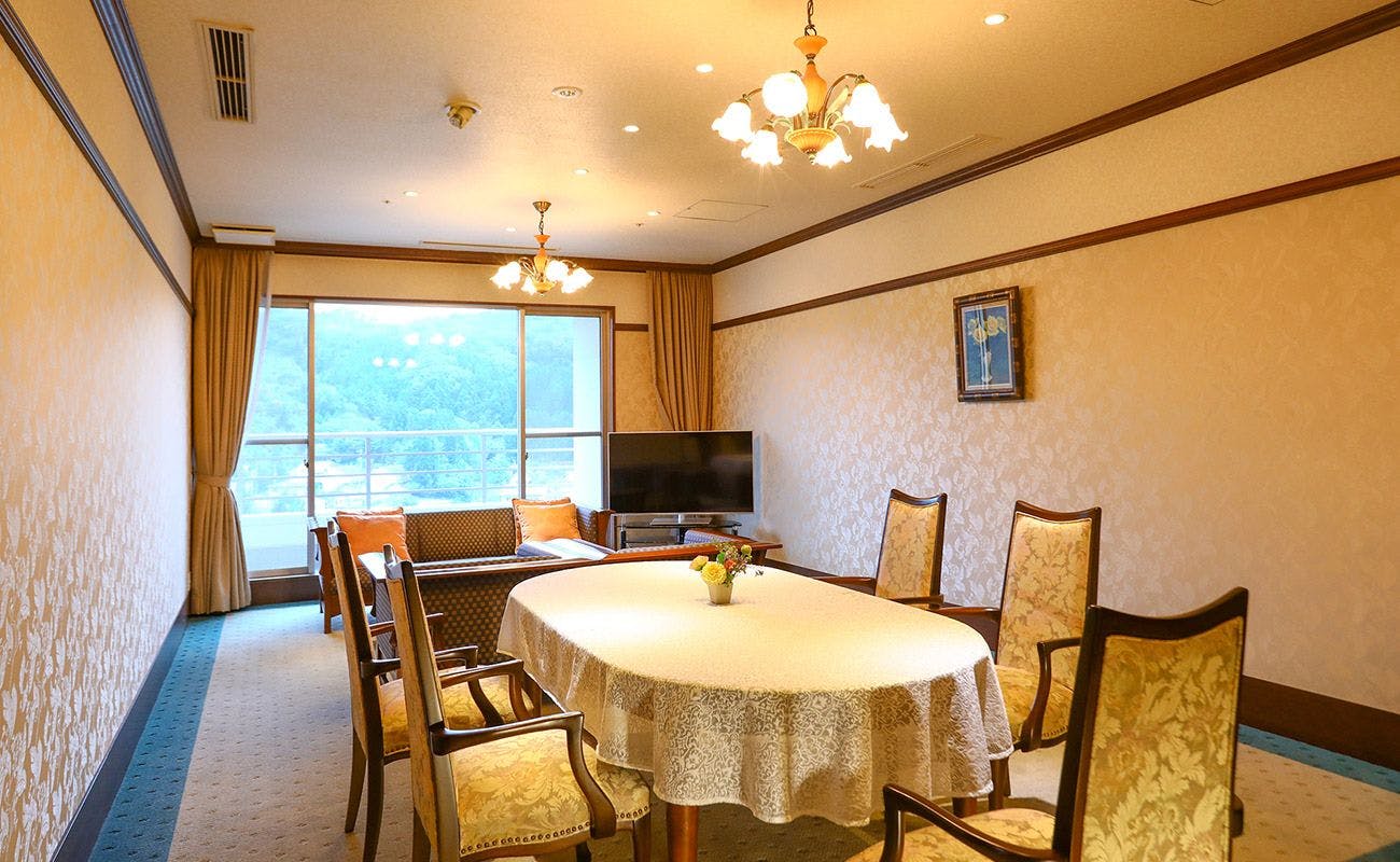 貴賓室10畳+4.5畳【5名定員】【アメニティー】・バスタオル ・フェイスタオル ・半纏 ・帯・ハンドソープ ・ヘアブラシ ・歯ブラシ ・ペットボトル(水)・お茶パック ・紙コップ ・グラス ・湯のみ【備品】・TV ・冷蔵庫 ・ドライヤー ・セーフティーボックス・湯沸かしポット ・空気清浄機 【設備】・エアコン ・トイレ(ウォッシュレット)