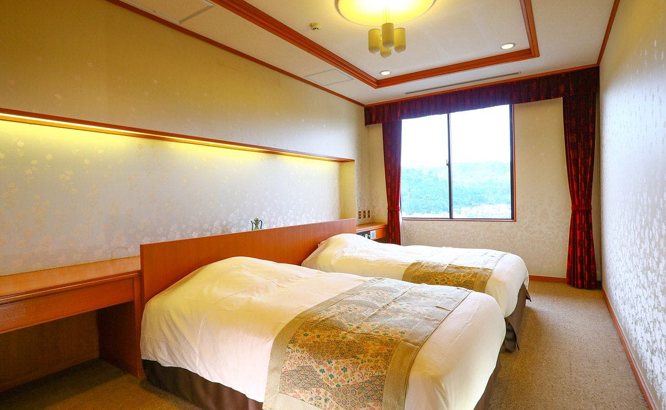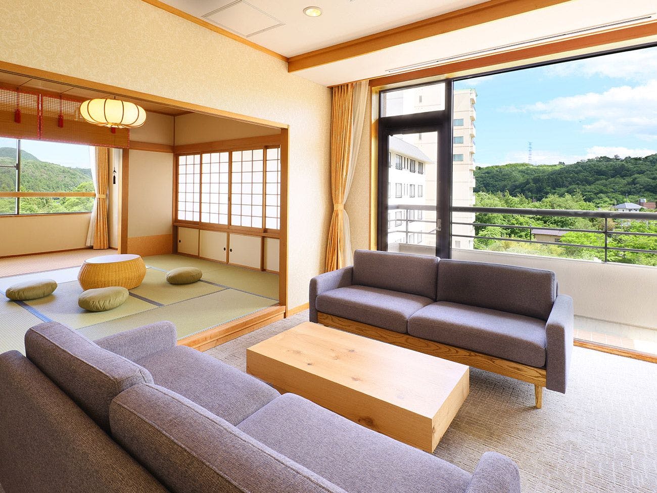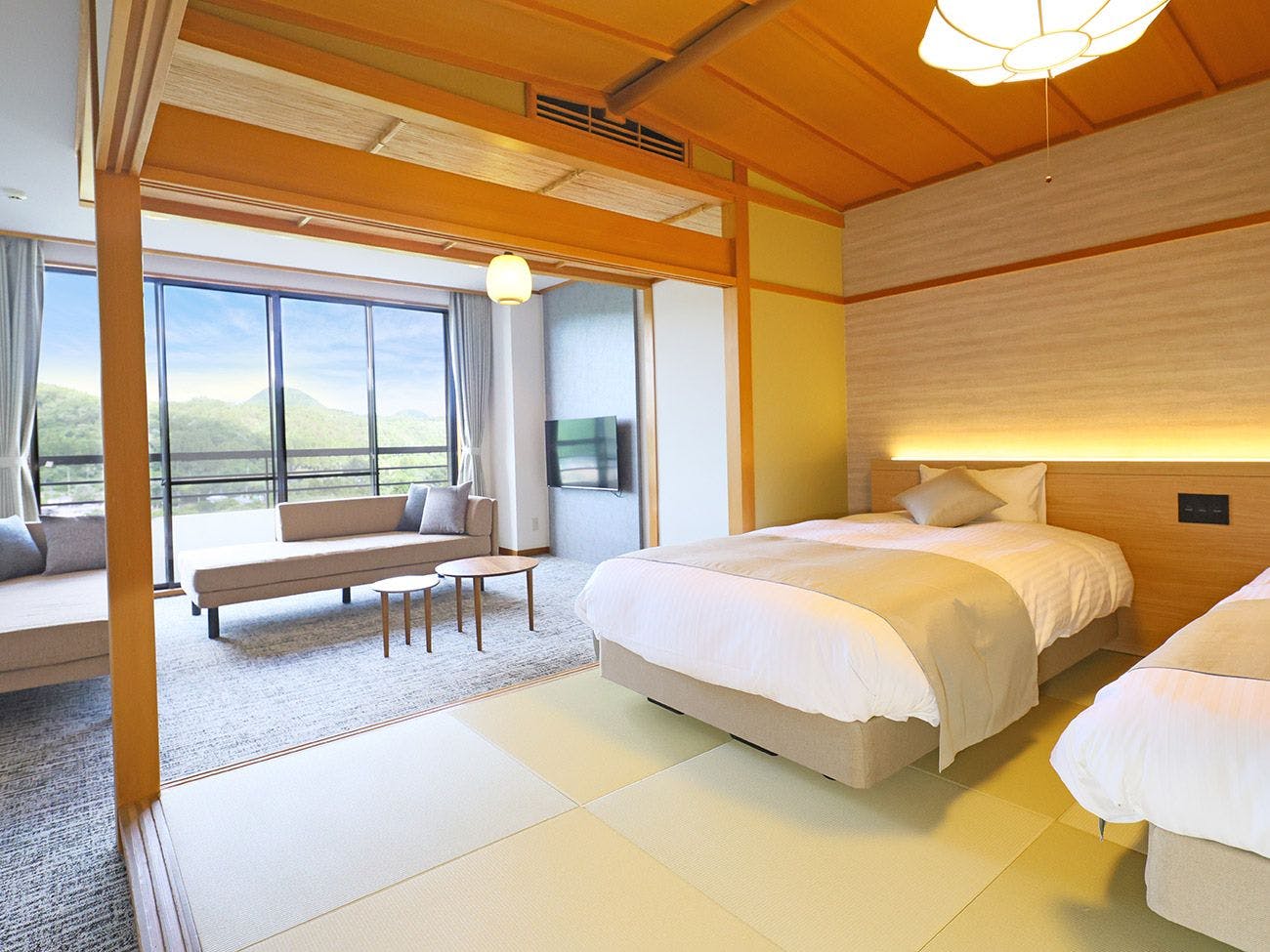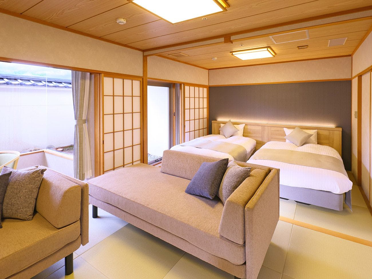 琉球畳の上にベッドを2台ご用意。和と洋のコラボレーションでゆったりと、たおやかにお寛ぎいただけるモダンなお部屋です。※3台目以降のベッドはデイベッドとなります。※低層階のお部屋の為、景色はご覧いただけません【アメニティー】・バスタオル ・フェイスタオル ・半纏 ・帯・ハンドソープ ・ヘアブラシ ・歯ブラシ ・ペットボトル(水)・お茶パック ・紙コップ ・グラス ・湯のみ【備品】・TV ・冷蔵庫 ・ドライヤー ・セーフティーボックス・湯沸かしポット ・空気清浄機 【設備】・エアコン ・トイレ(ウォッシュレット)