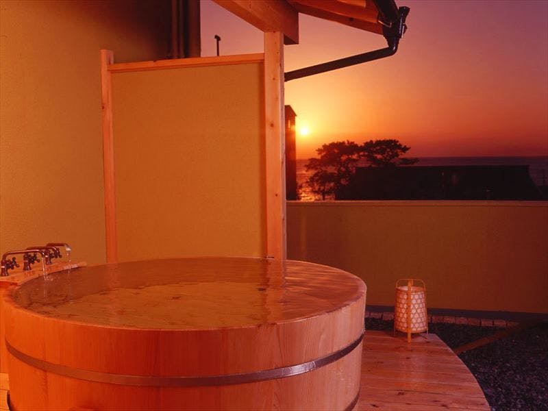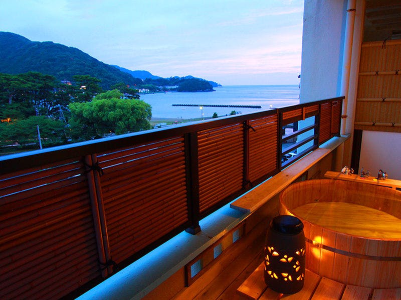 【温泉の露天風呂を設えた露天付客室 最上階駿河湾の眺望をお楽しみいただけます】