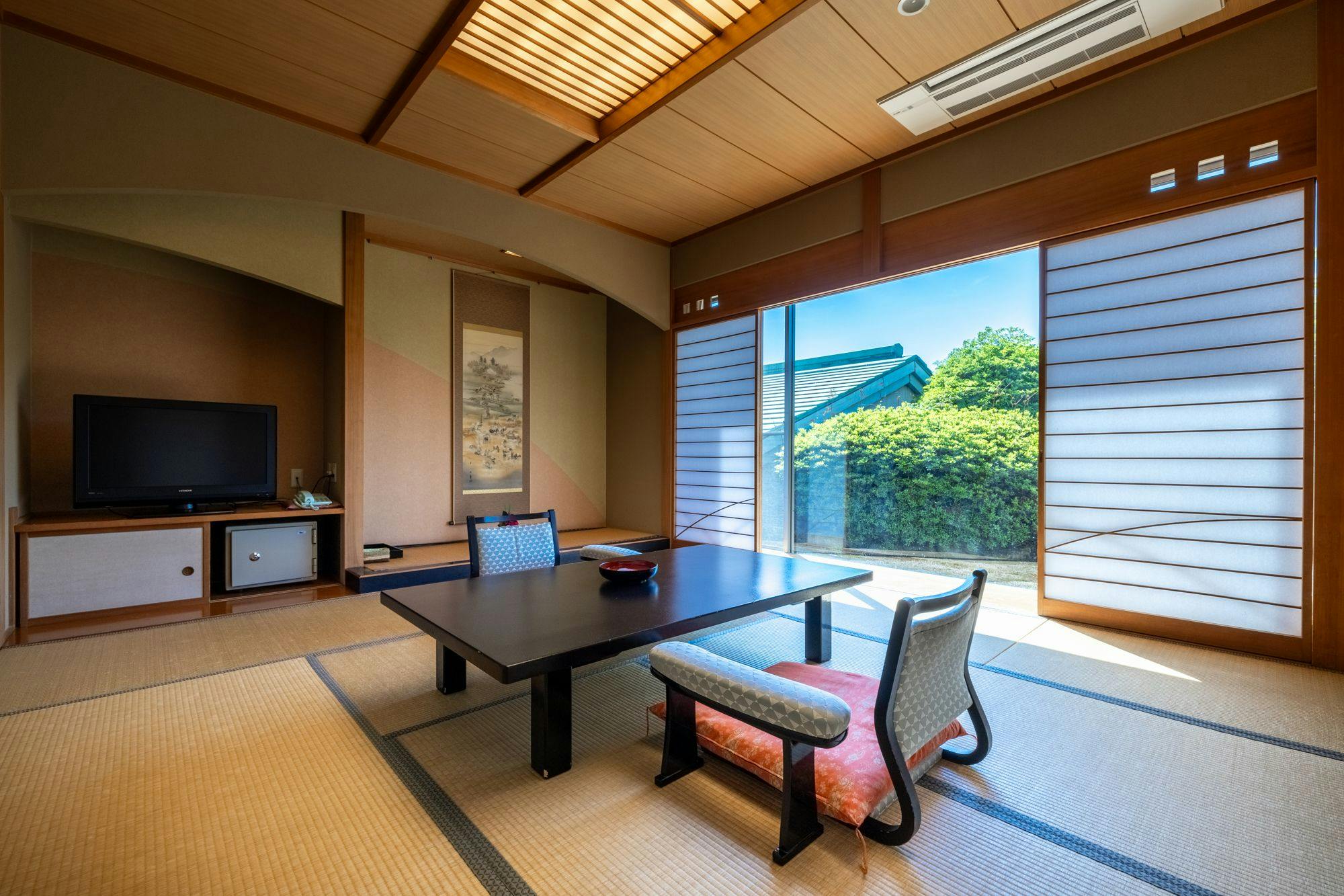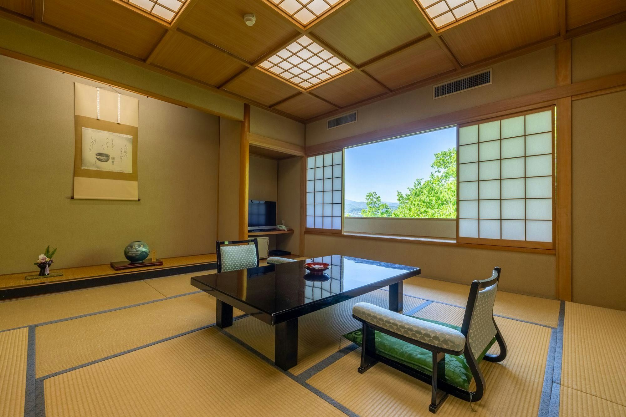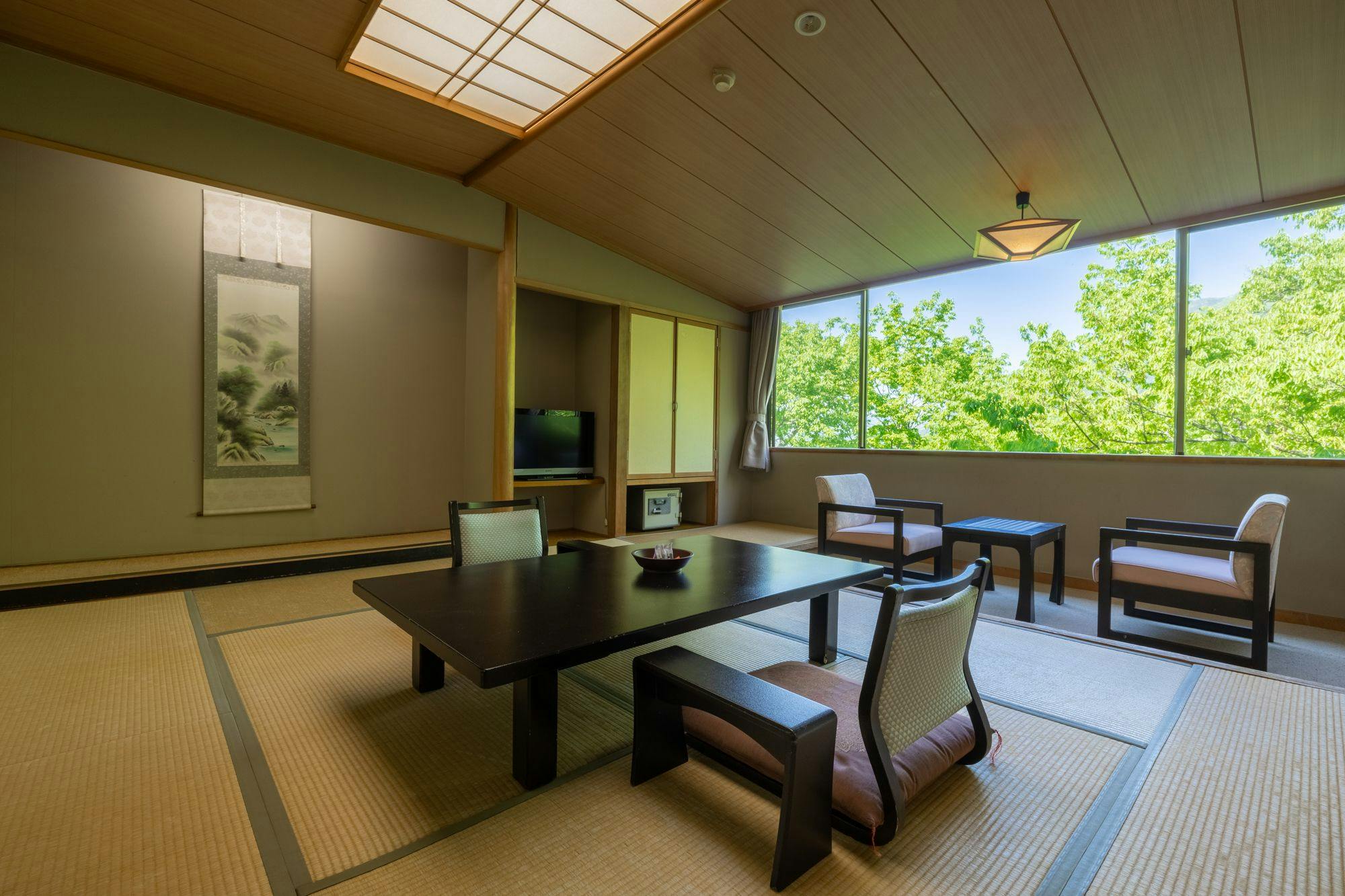 大きな窓から明るい光が差し込む和室10畳のお部屋。緑を間近に望む当館のスタンダード客室です。バス・シャワートイレ付き冷暖房完備「全館Wi-Fi利用可能」