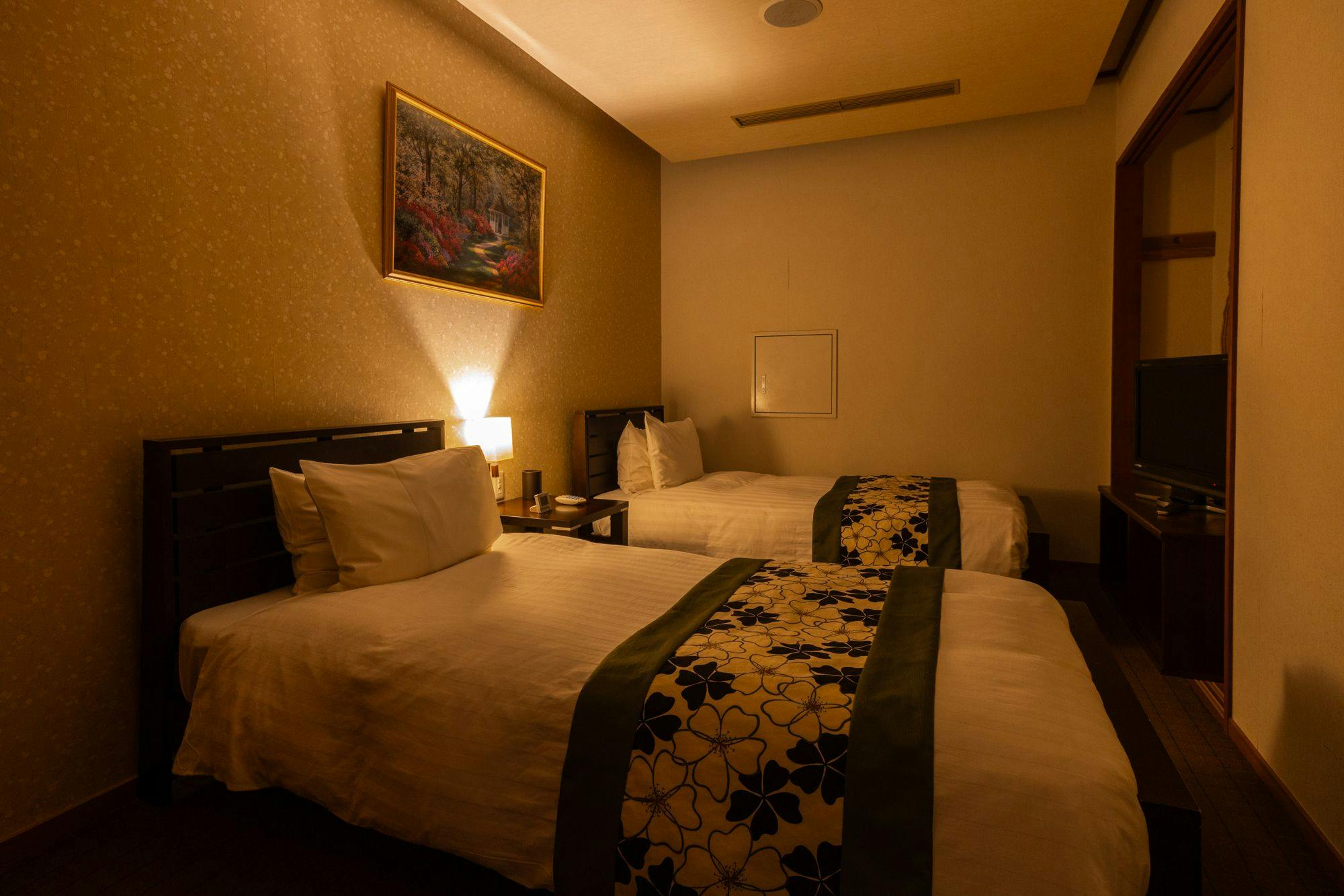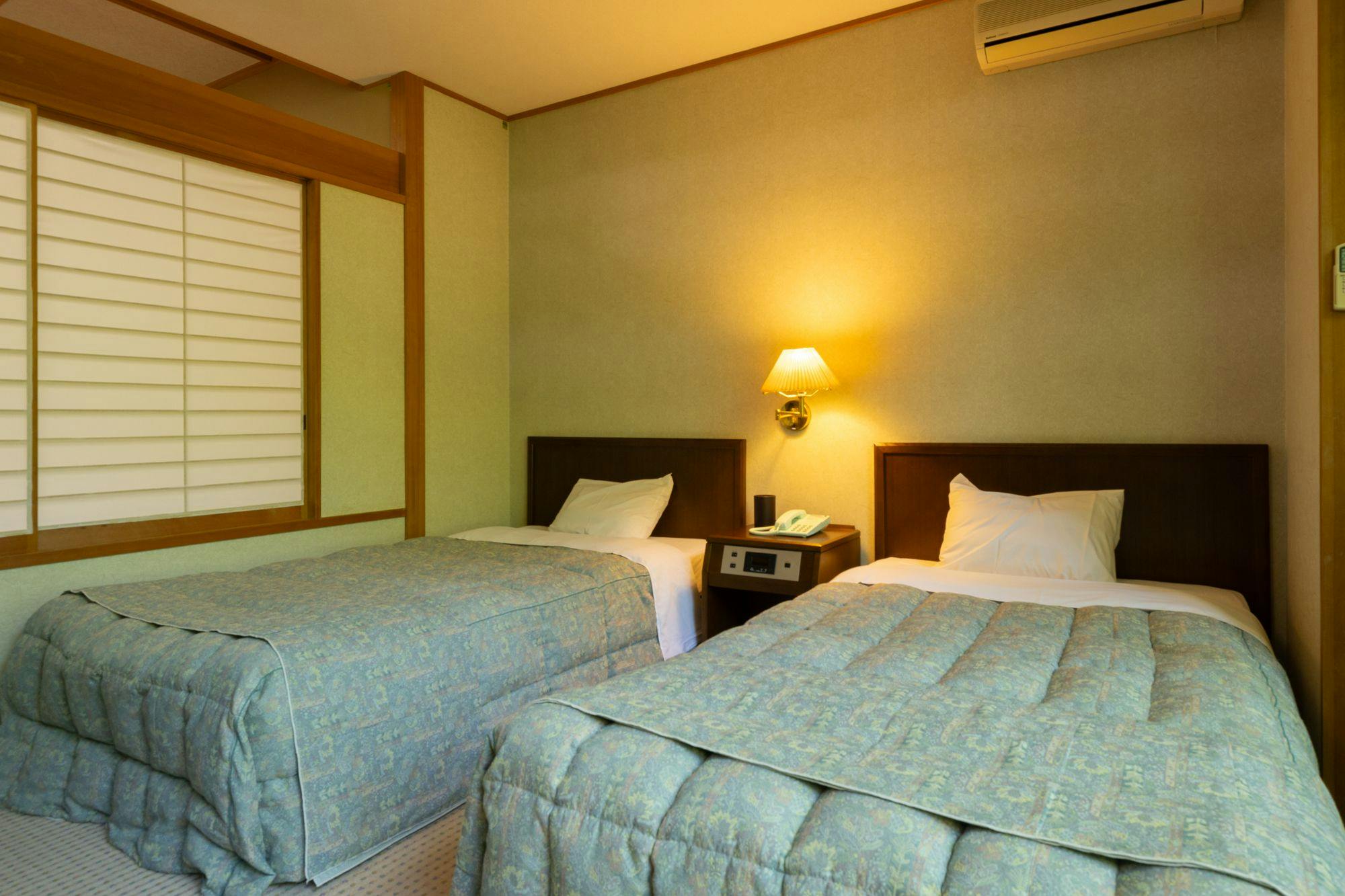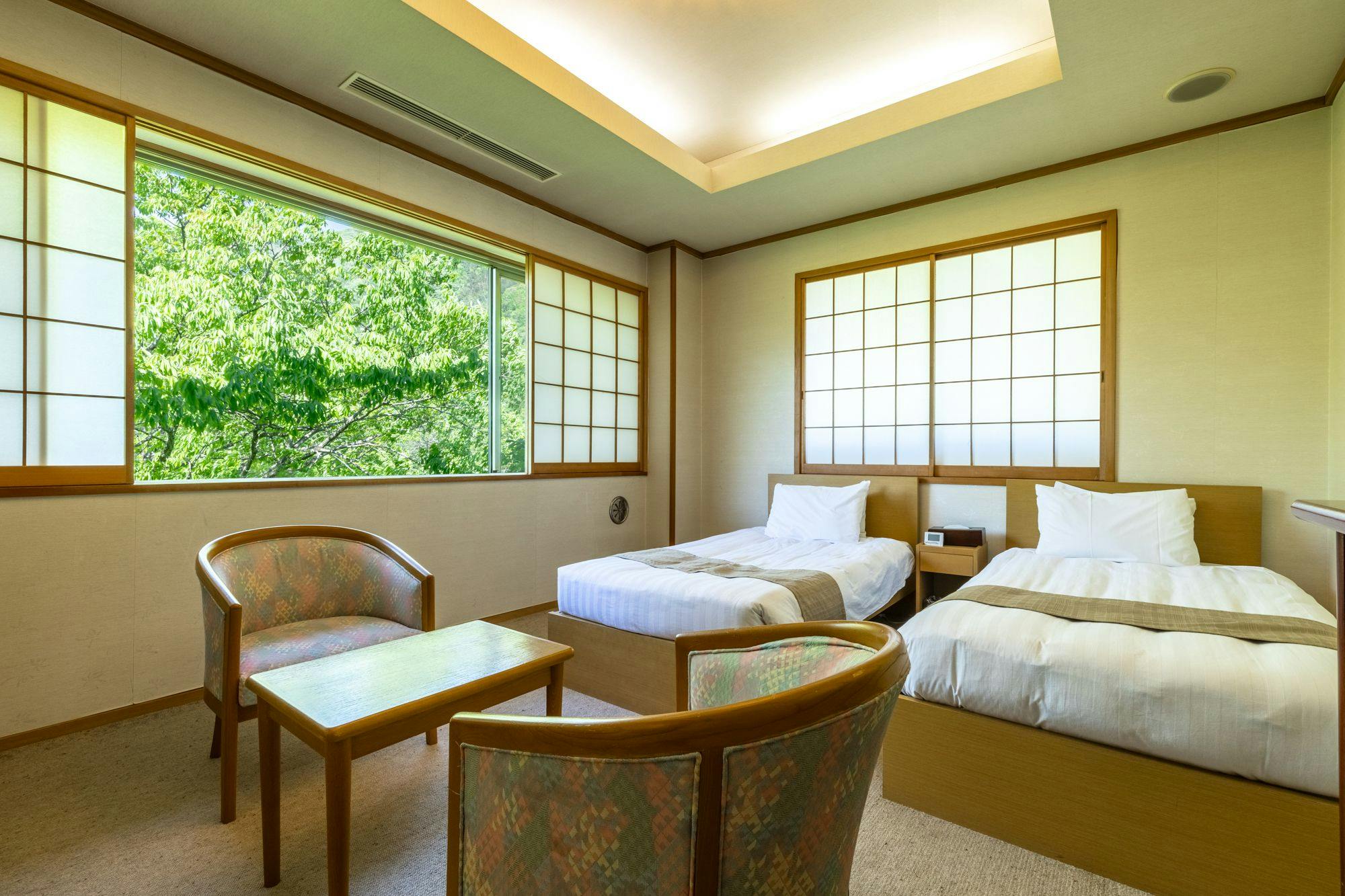 広々とゆとりある和室に、ツインベッドを備えた寝室+バス、シャワートイレ付の客室。窓辺にはソファーを備え、木立を眺めながらお寛ぎいただけます。「全館Wi-Fi利用可能」