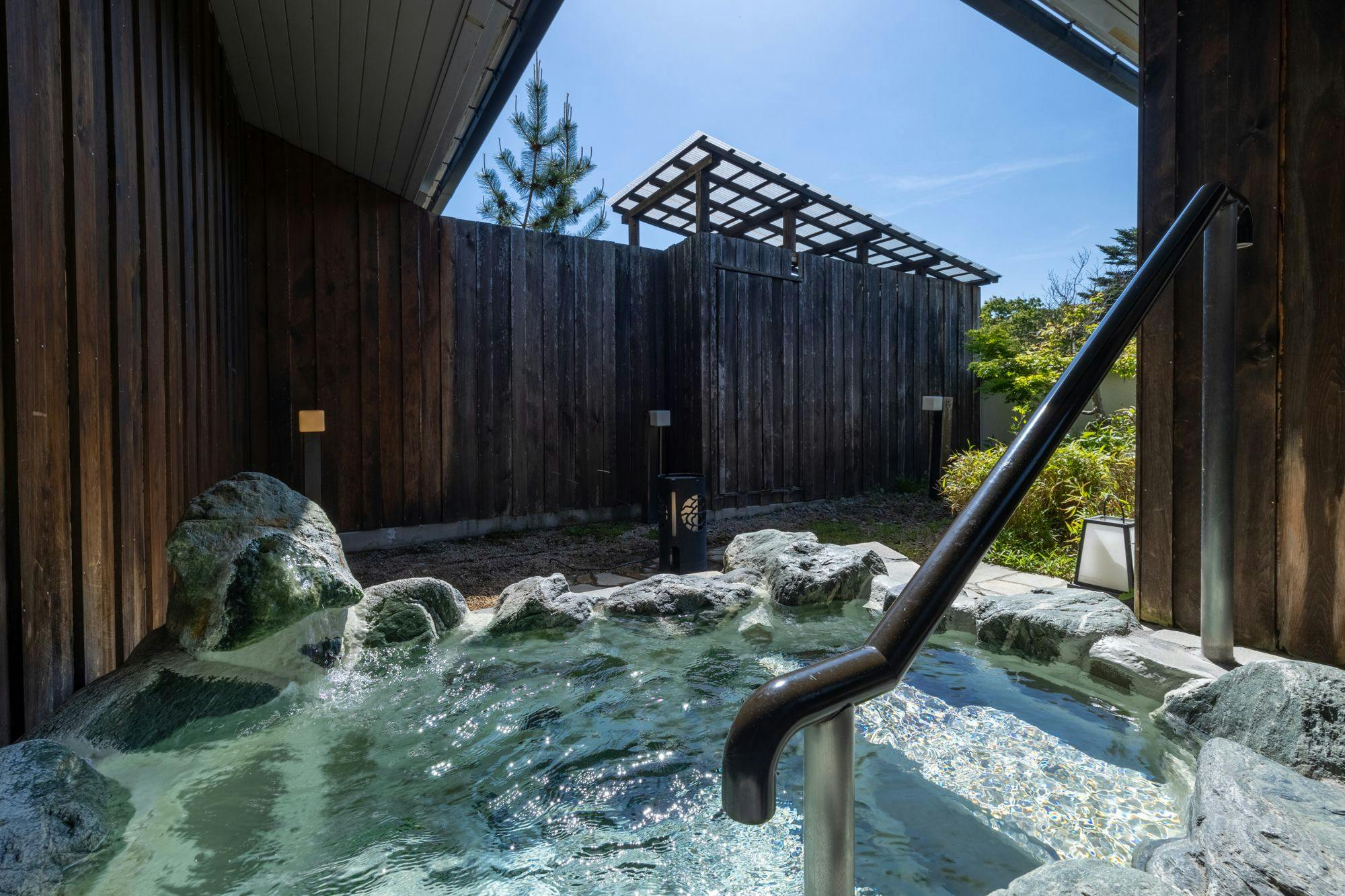 尾瀬の山並みと老神渓谷を一望いただける、広々とした和室とリビングルーム。石造りの露天風呂では、昼間は空と山々に囲まれ夜はライトアップした幻想的なひとときを過ごしていただけます。 全室フリーWiFiを完備。