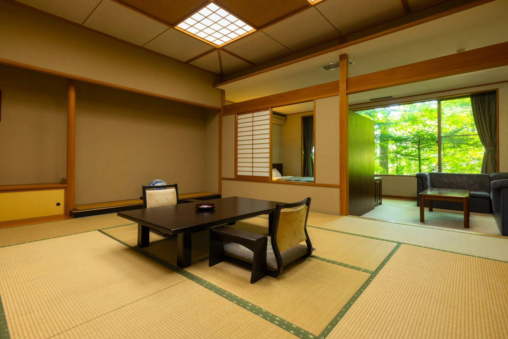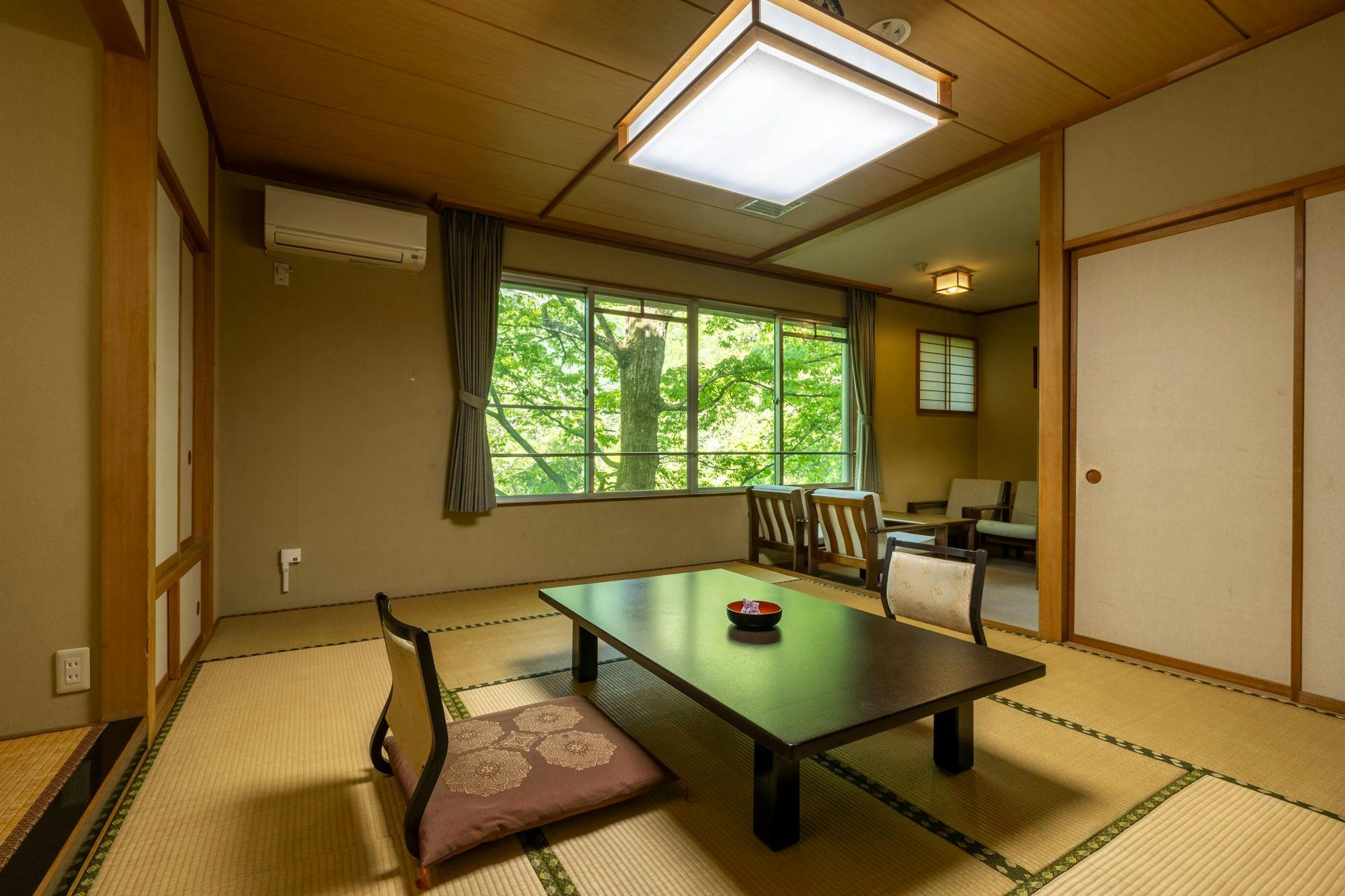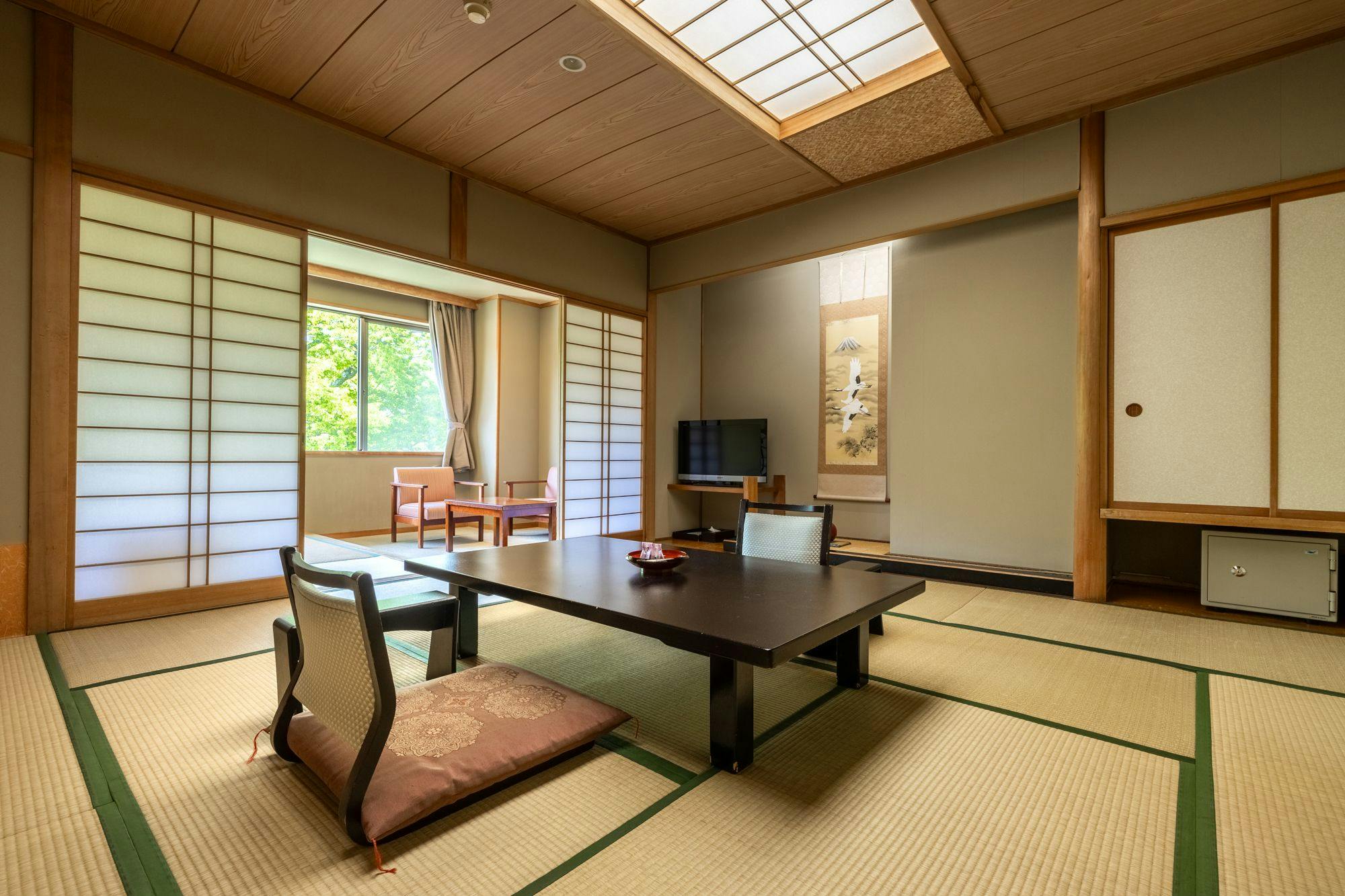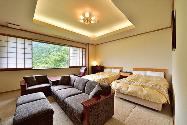 尾瀬の方面の山並みが一望できる最上階客室。12畳和室+6畳和室+ツインベッドルーム+内風呂二間続きの和室に、窓からは老神渓谷を望む広々としたベッドルーム。老神温泉の豊かな自然を感じながらゆっくりと寛いでいただけます。※客室の展望風呂は温泉ではございません。(沸かし湯となります。)全室フリーWiFiを完備。