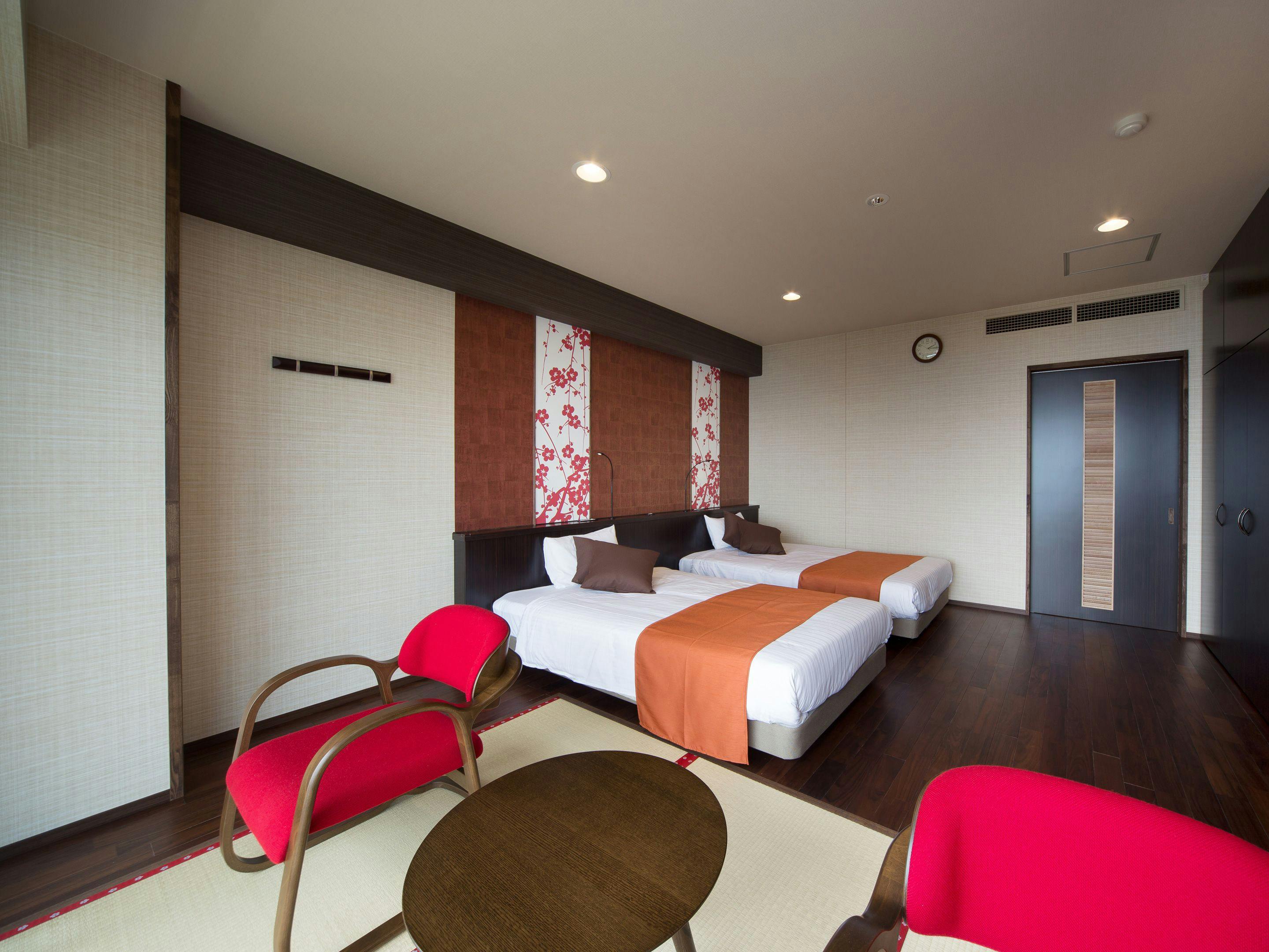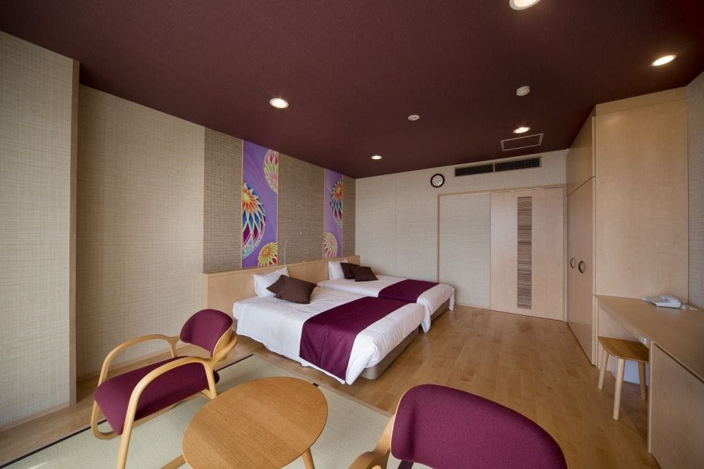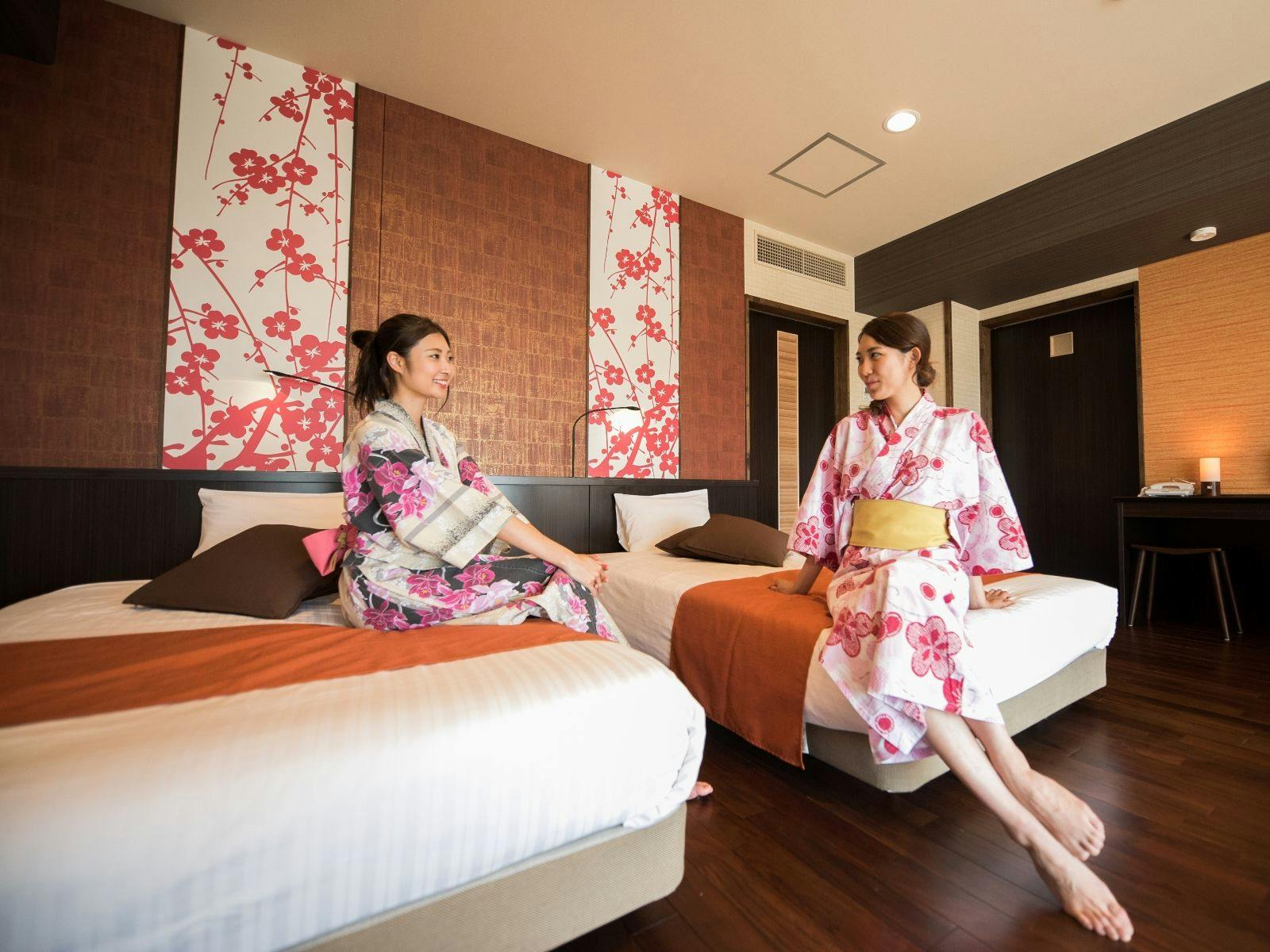 ・デュベスタイルのベッドが2つ・寝心地抜群のシモンズのマットレスを採用・セミダブルのベッド(縦200cm×横110cm)×2台・ベッドは2台つけることができます。・3名様利用の場合はお一人様お布団となります。