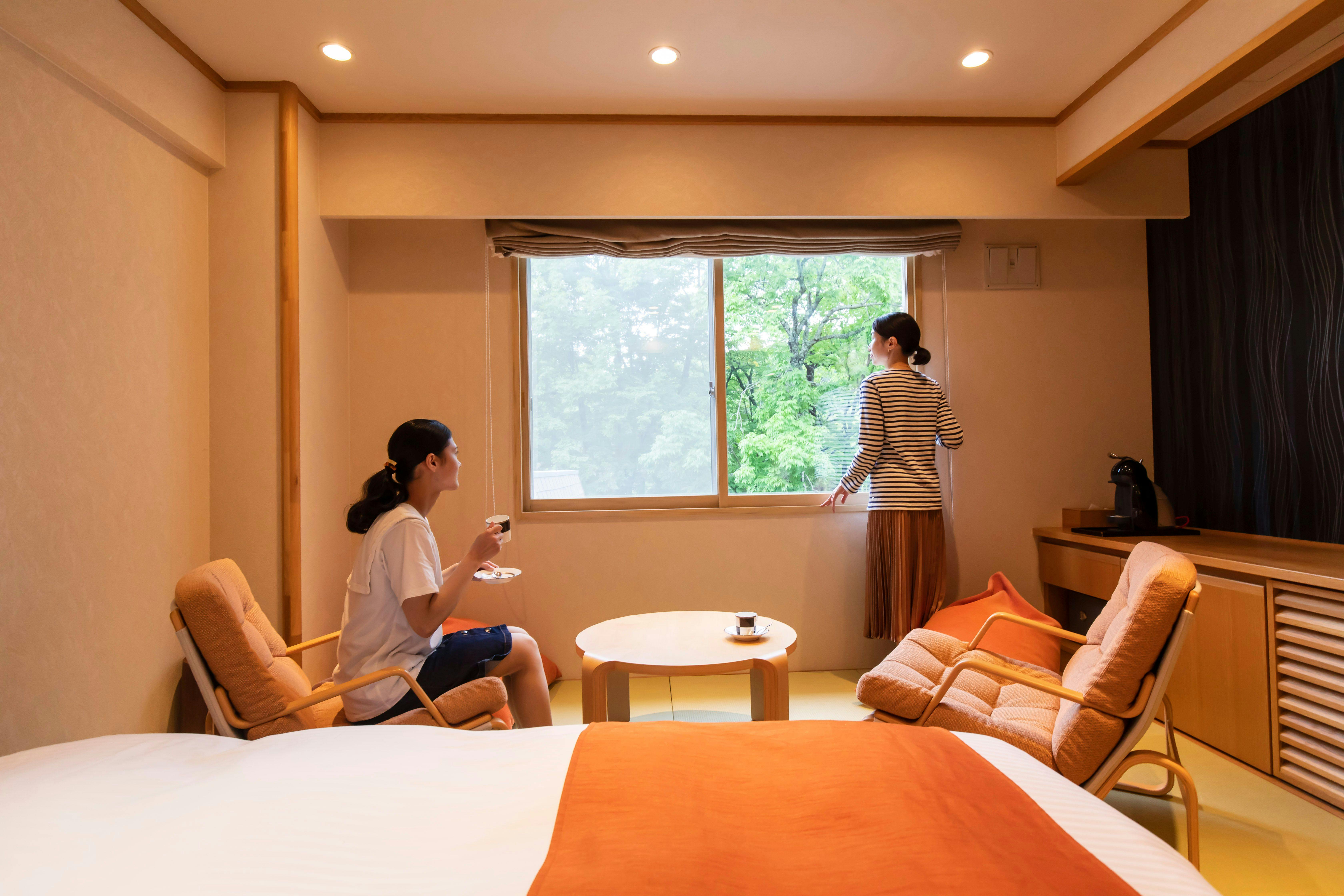 和の趣と洋の機能美を配した寛ぎの佇まい。 豊かに広がる落ち着きと心和むやすらぎの中、満ち足りた時間をお過ごしください。お風呂はお部屋についておりませんので、2F大浴場の「支笏湖温泉」をお楽しみください。朝には野鳥のさえづりが聴こえてきます