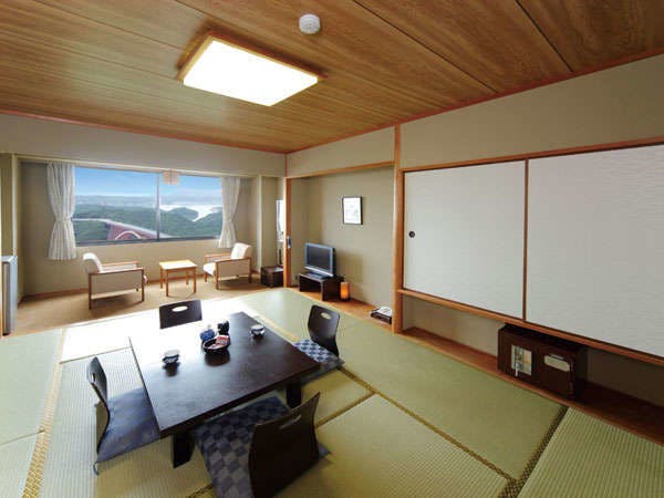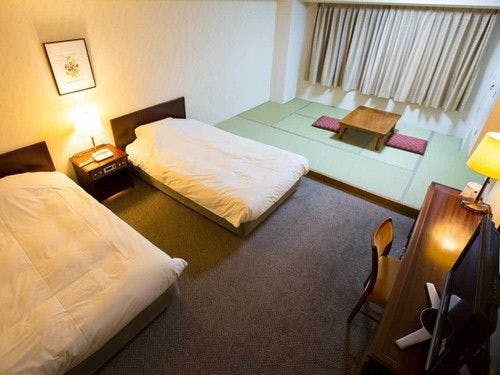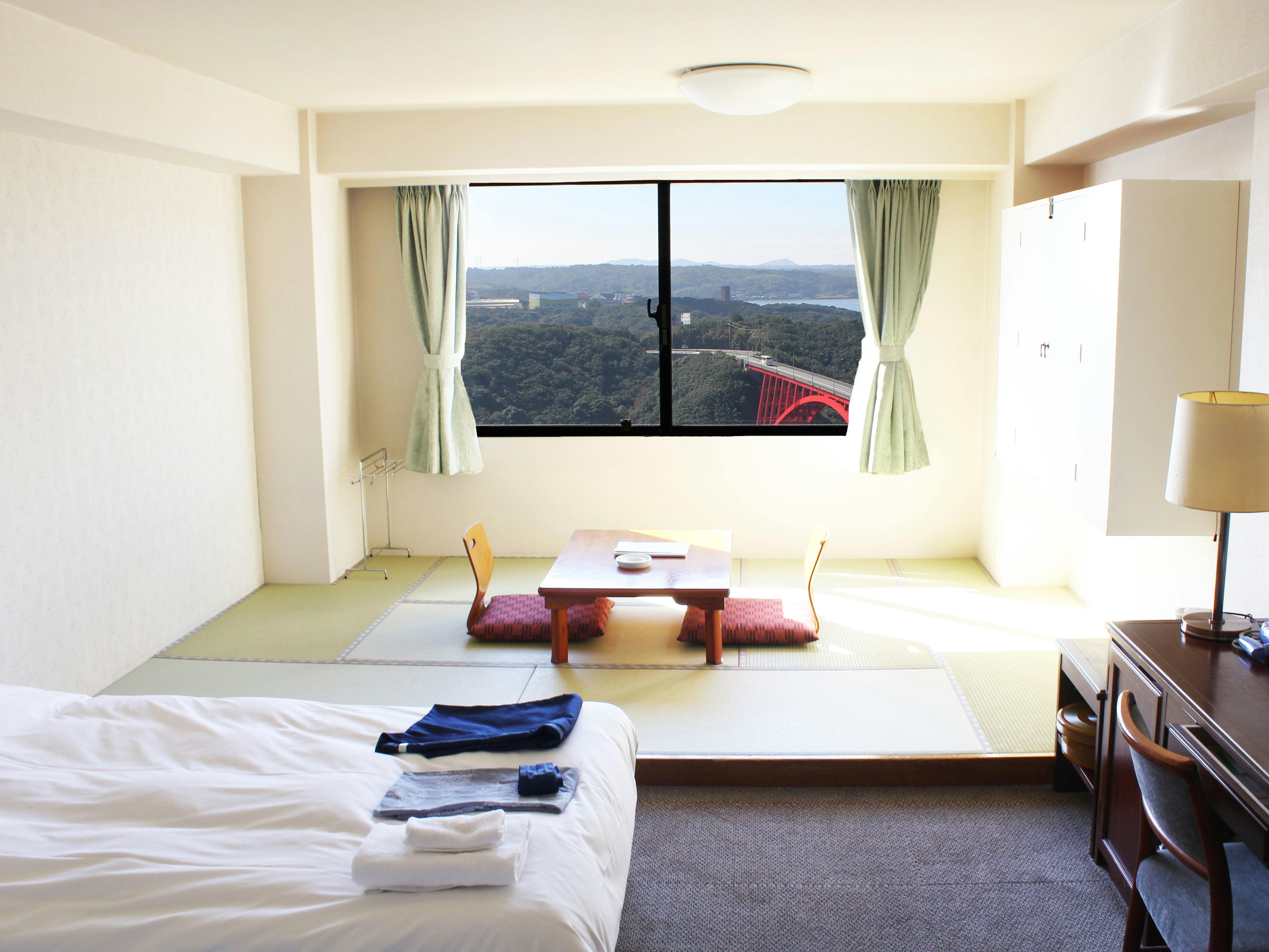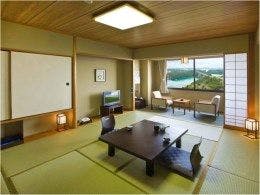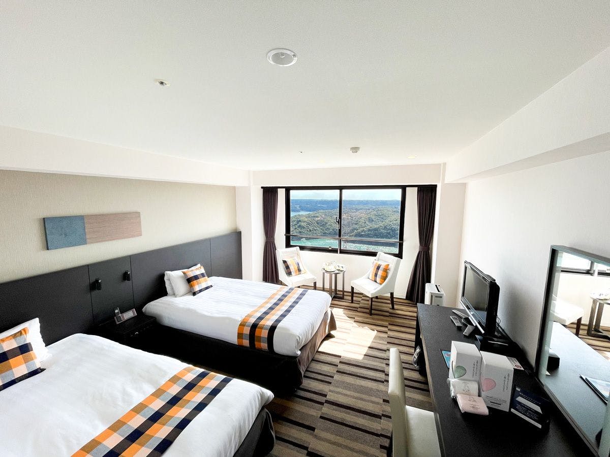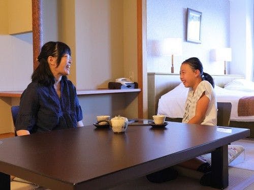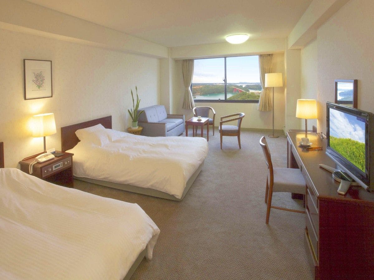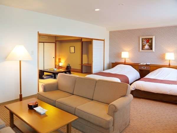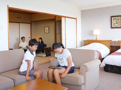 ゆったりとした72平米のお部屋はベッド2台と和室8畳の贅沢な間取り。もちろん、バス・トイレは独立式です。アメニティにはミキモトコスメや伊勢志摩に縁のある「メデリン珈琲」や「伊勢の和紅茶」をご用意いたしました。