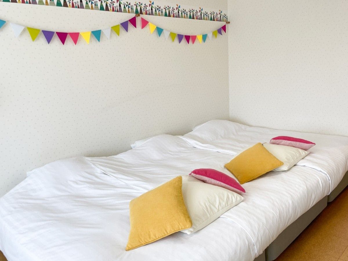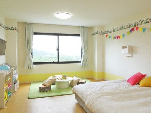 0~6歳のお子様連れのご家族にオススメ!ベッドはセミダブルサイズのベッドを3台並べてくっつけた広々ハリウッドタイプ!床はコルク素材で土足厳禁!ハイハイする赤ちゃんにも安心です。お部屋にはパパママに嬉しいお子様備品を完備しております。