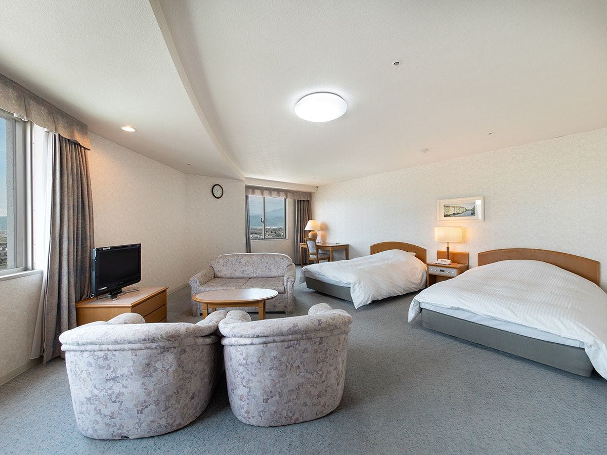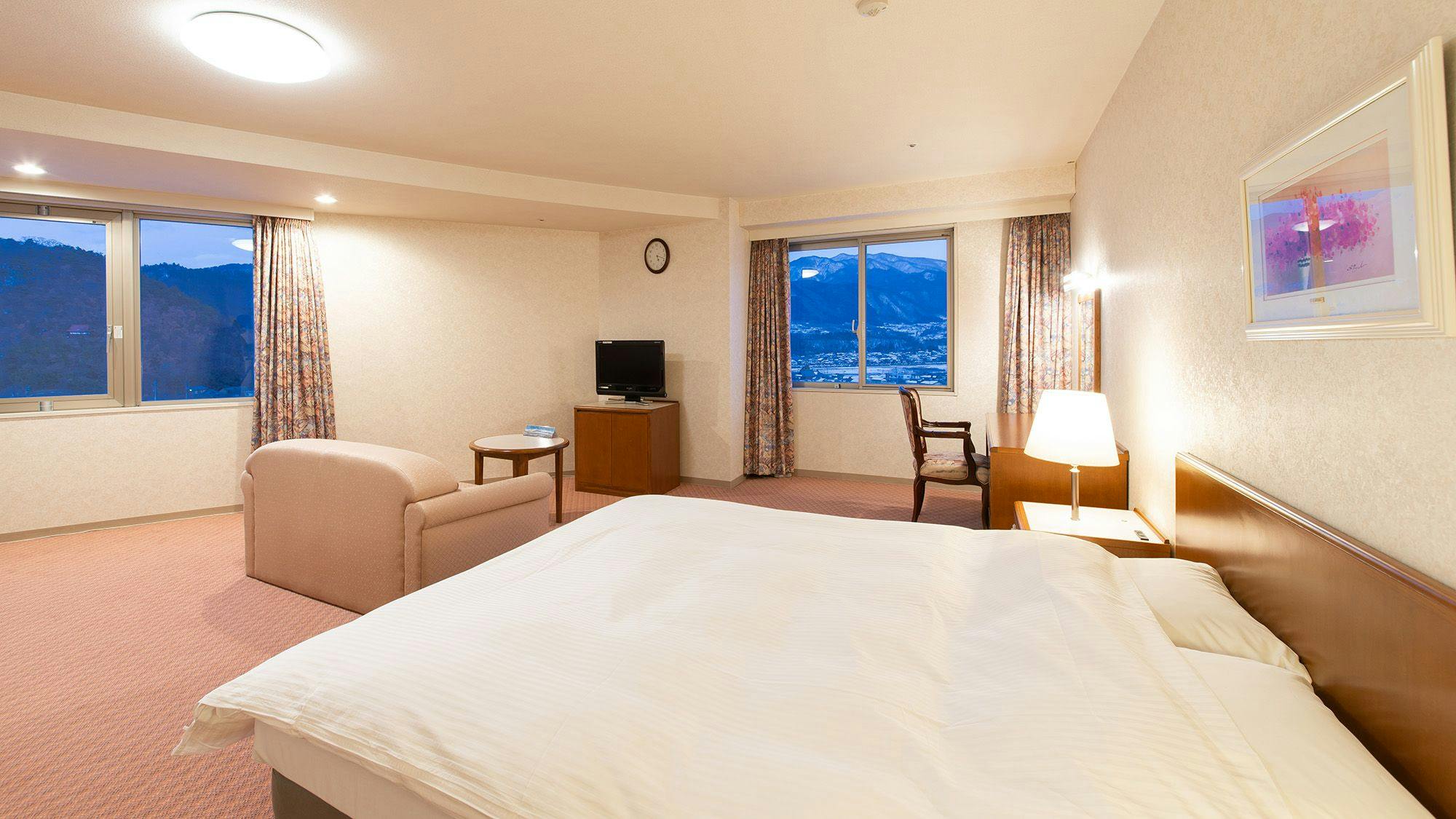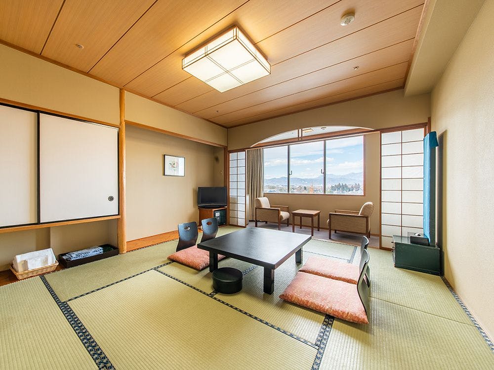 北アルプスや北信五岳を望む55平米のゆったりとした寛ぎのお部屋です。マッサージチェア付きで、旅の疲れを癒せます。