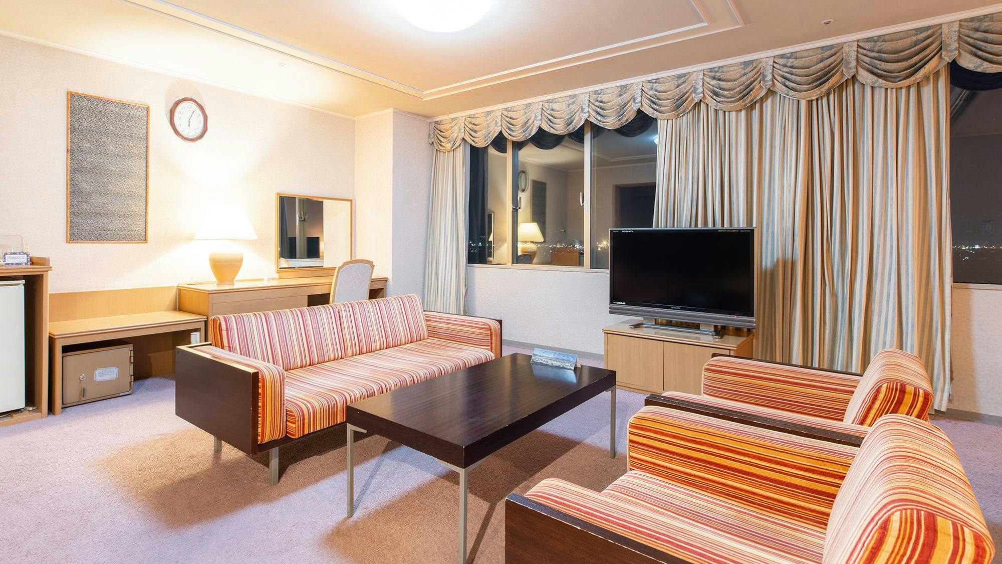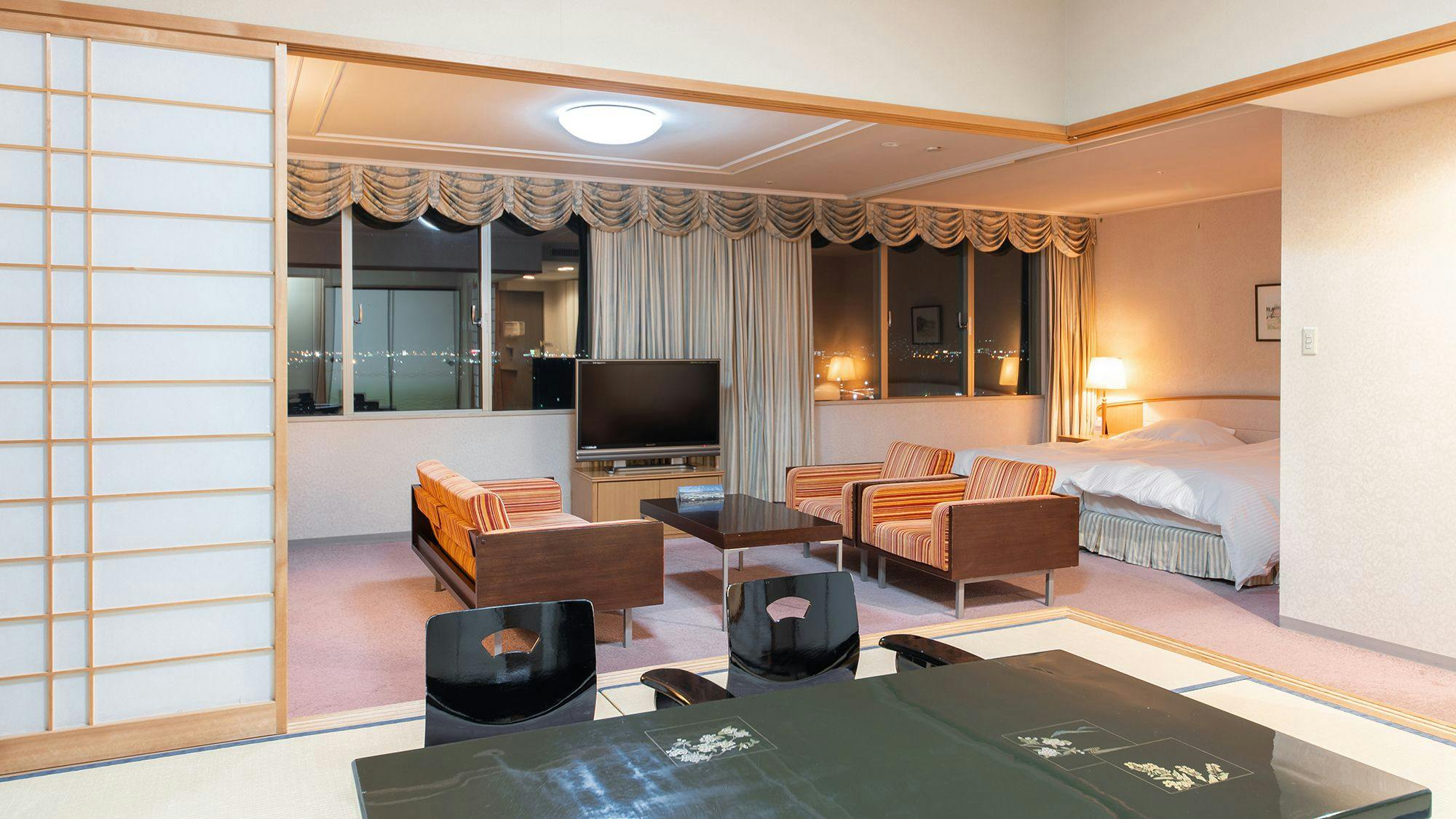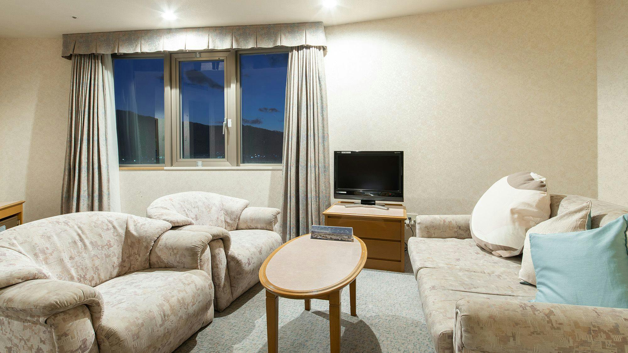 北アルプスや北信五岳を望む55平米のゆったりとした寛ぎのお部屋です。マッサージチェア付きで、旅の疲れを癒せます。