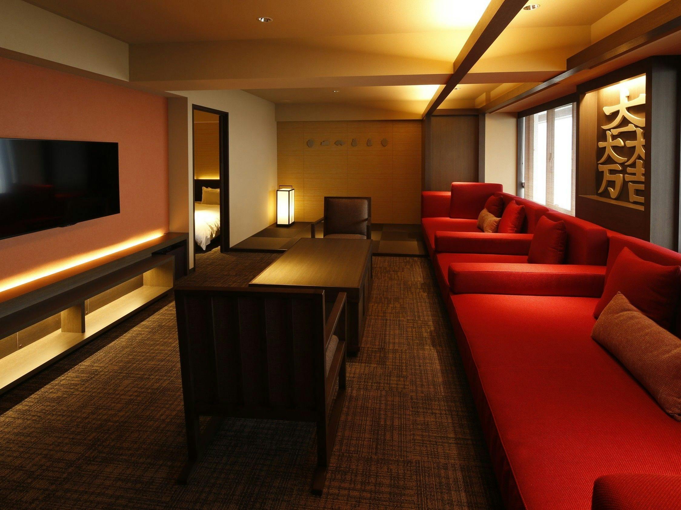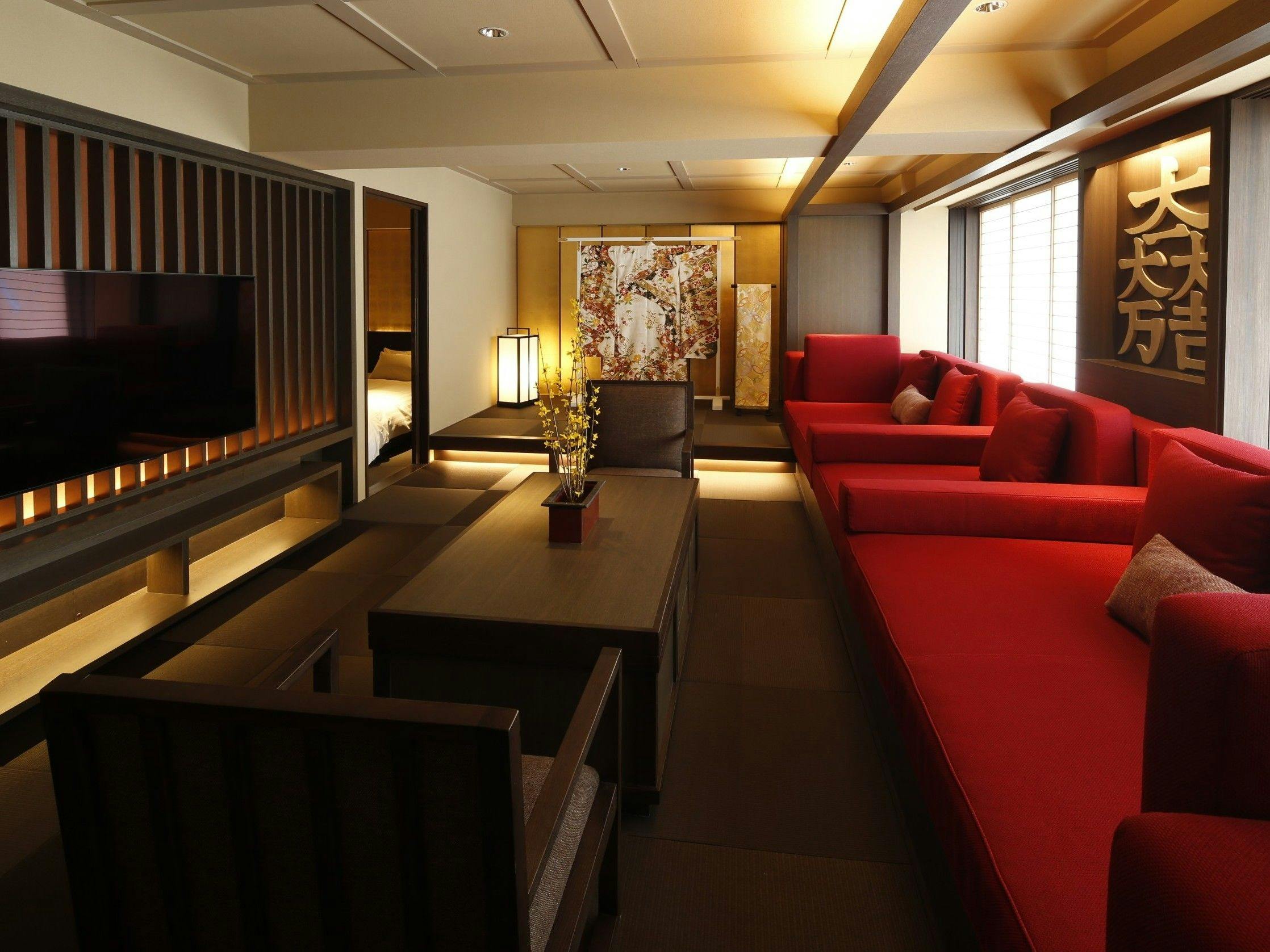 約6メートルの紫に次ぐ高位の色、緋色(あけいろ)のソファーは湖へ寄り添うように配し、DENと言う名に相応しく心なごむエリアに。殿上人のように戦国武将も見たであろう琵琶湖を行きかう野鳥や、季節ごとに彩りを変える山々をお楽しみいただけます。DEN就寝時にベッドメイキングし、1室6名様までご利用いただけるファミリーステイにもおすすめのコンセプトルームです。
